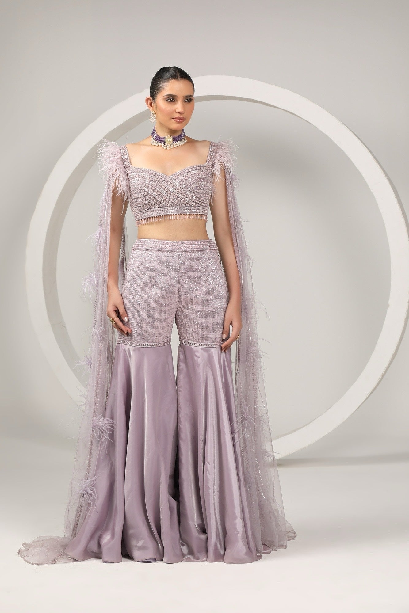 A breathtaking fusion of power-dressing and ethereal romance, Amethyst Orbit is a definitive statement in modern bridal luxury. Bathed in a sophisticated shade of muted amethyst, this ensemble reimagines the traditional sharara through an architectural lens. Designed for the woman who seeks a silhouette that is as sharp as it is soft, it balances the structural rigor of a jeweled bodice with the fluid, cloud-like movement of a floor-sweeping cape.