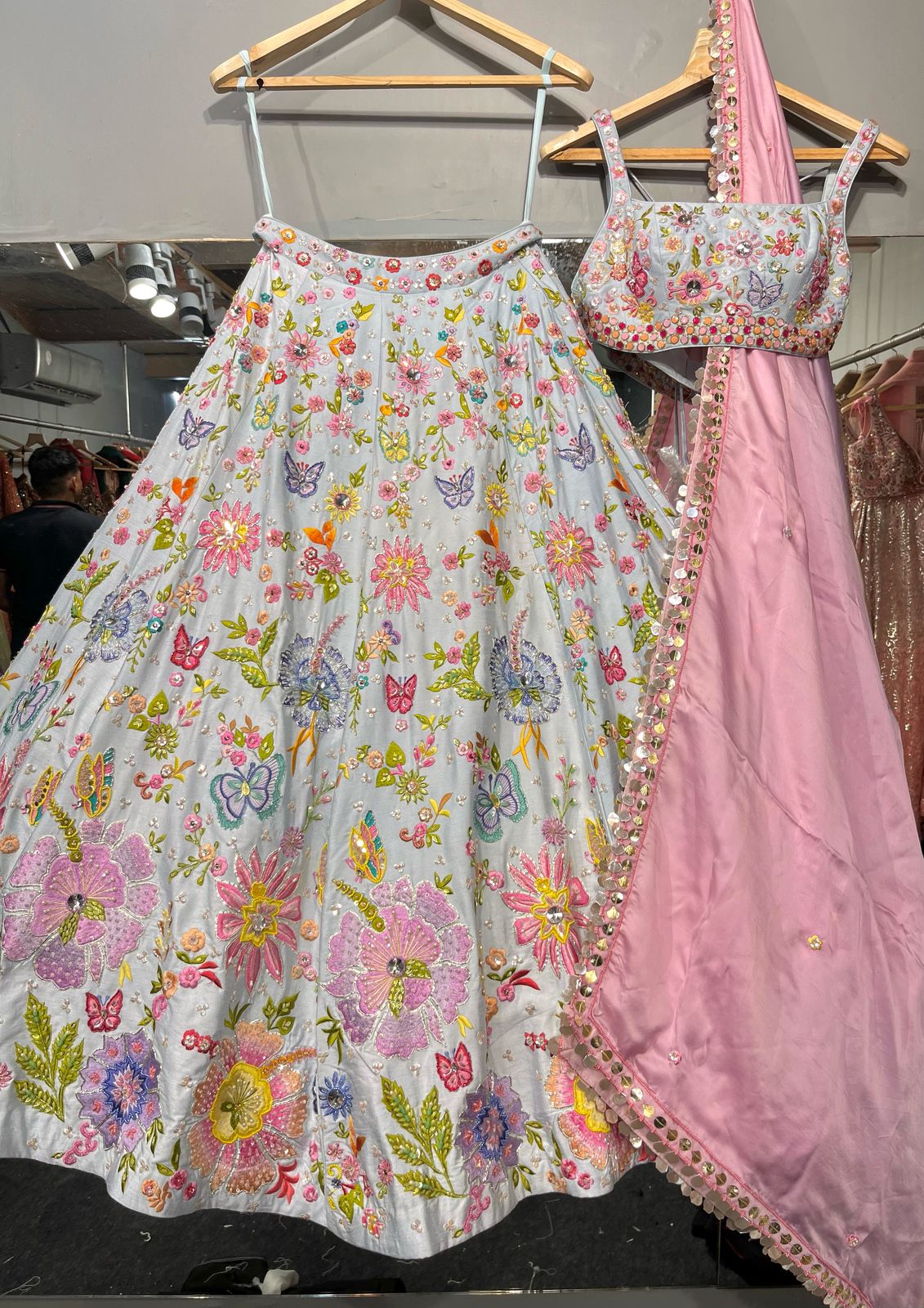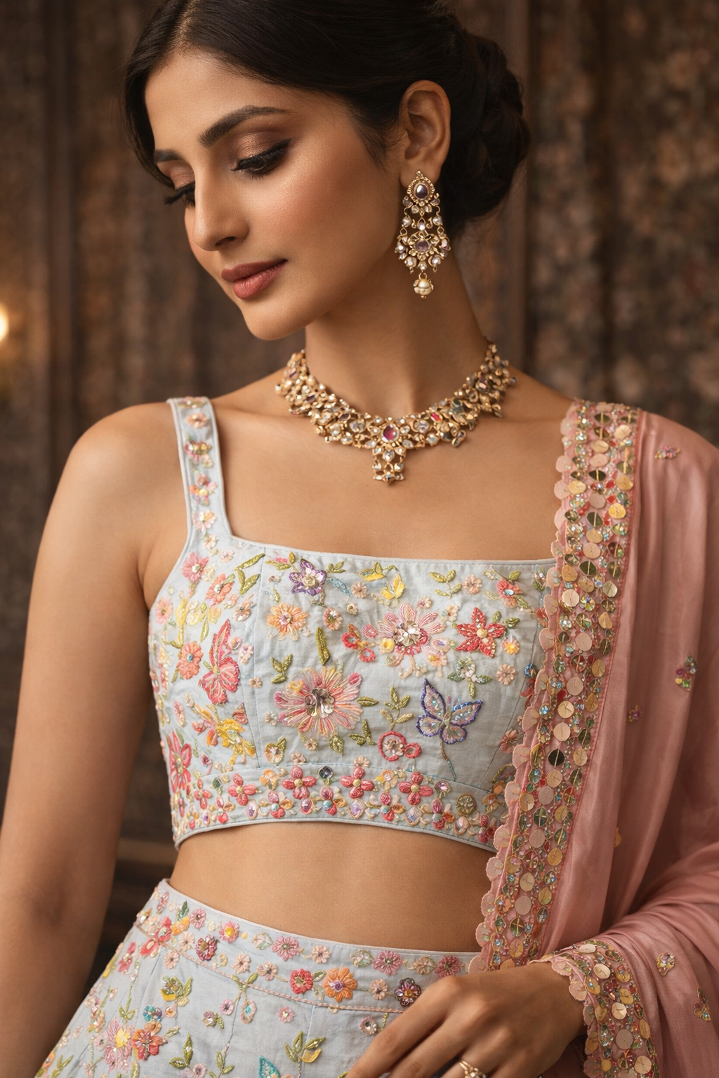 Crafted on a luminous ice-blue base, the ensemble is defined by its extraordinary multi-tonal silk thread-work. The silhouette is a living storybook, featuring oversized 3D-effect blossoms and hand-shaded butterflies that appear to have just landed on the fabric, creating a look of high-fashion naturalism.