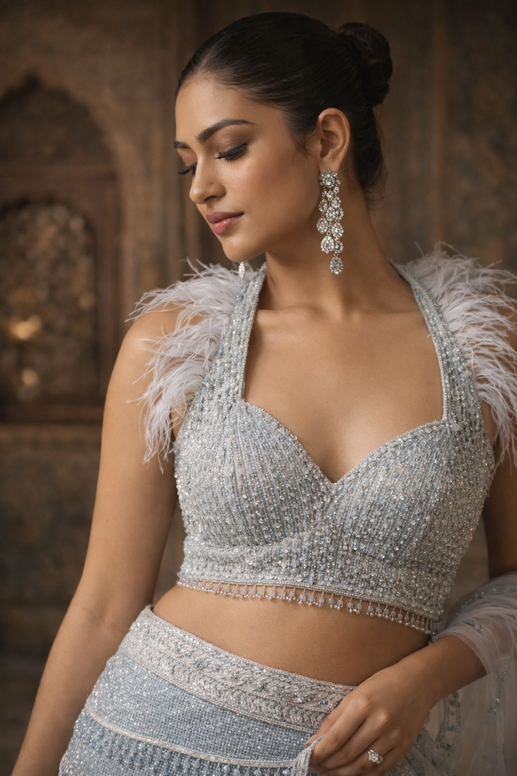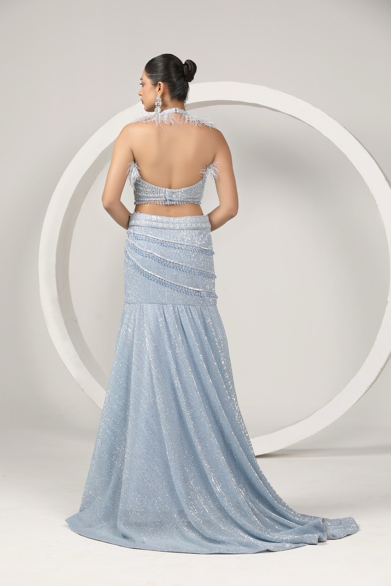 Crafted in a monochromatic palette of ice blue and crystalline silver, the silhouette is defined by its rhythmic linework. From the horizontal "ripple" embroidery on the hips to the soft cloud of feathers at the shoulders, every element is balanced to create a look of undeniable, cold-toned luxury.