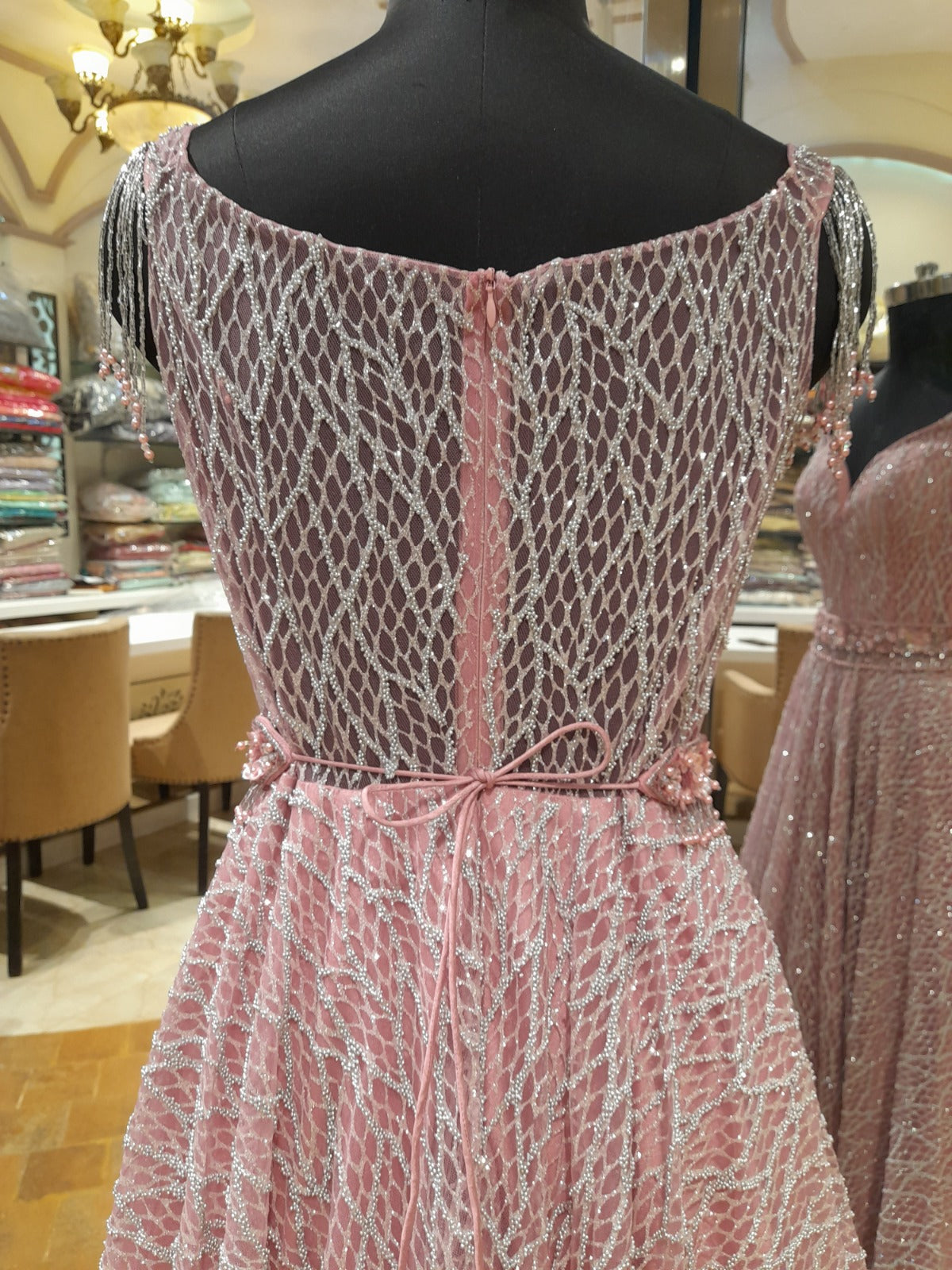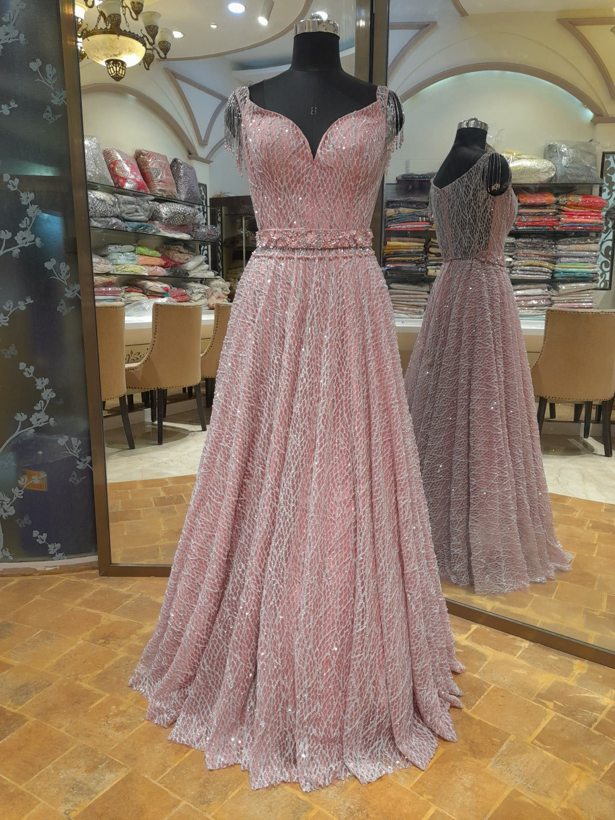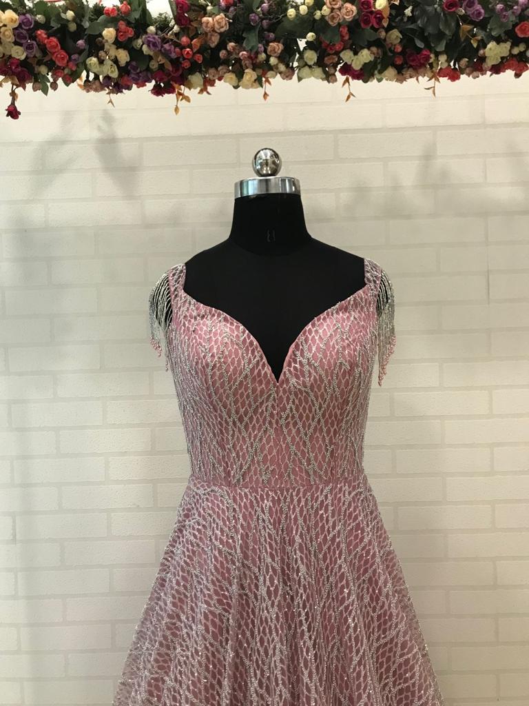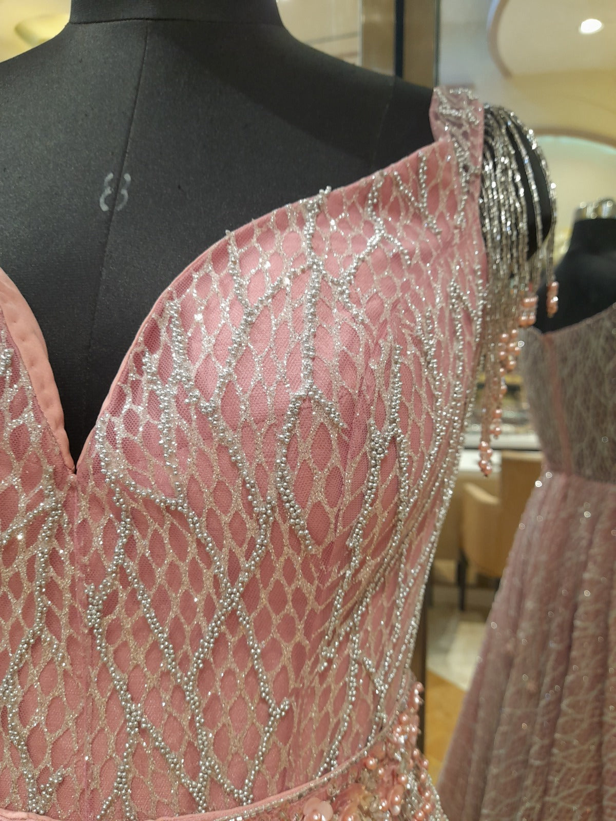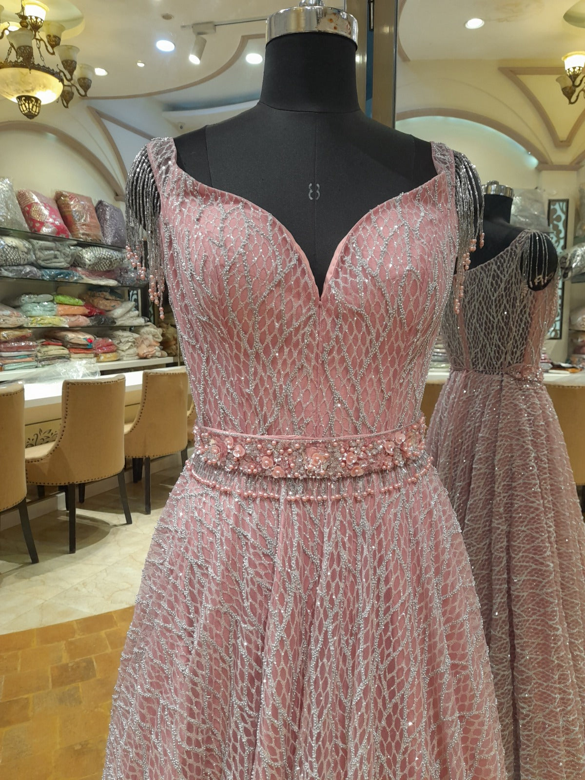 Designed in soft blush pink with silver metallic threading creating wave-like texture, the silhouette celebrates contemporary glamour through sweetheart neckline, fitted bodice, and flowing skirt. The shoulder fringe adds modern drama, the jeweled belt creates definition, and the textured fabric ensures constant shimmer from every angle. The coordinating dupatta maintains cohesion while the backless design adds statement appeal.