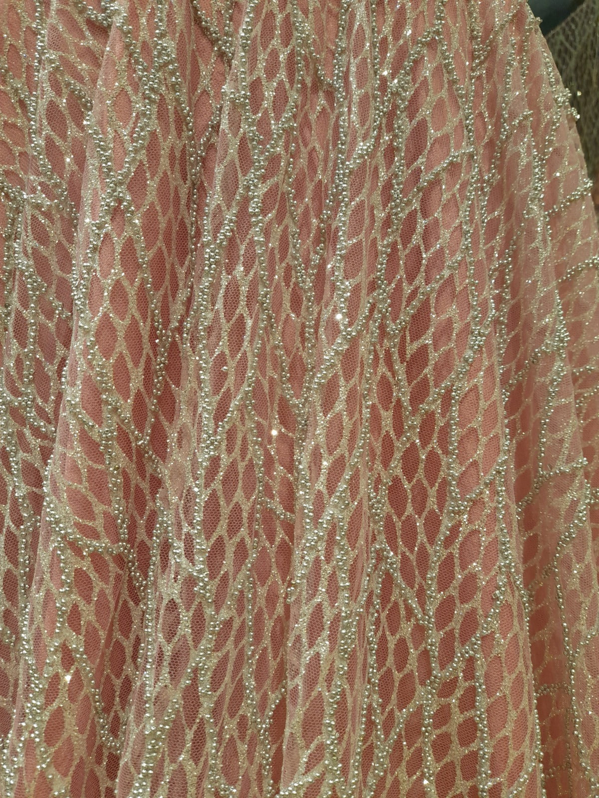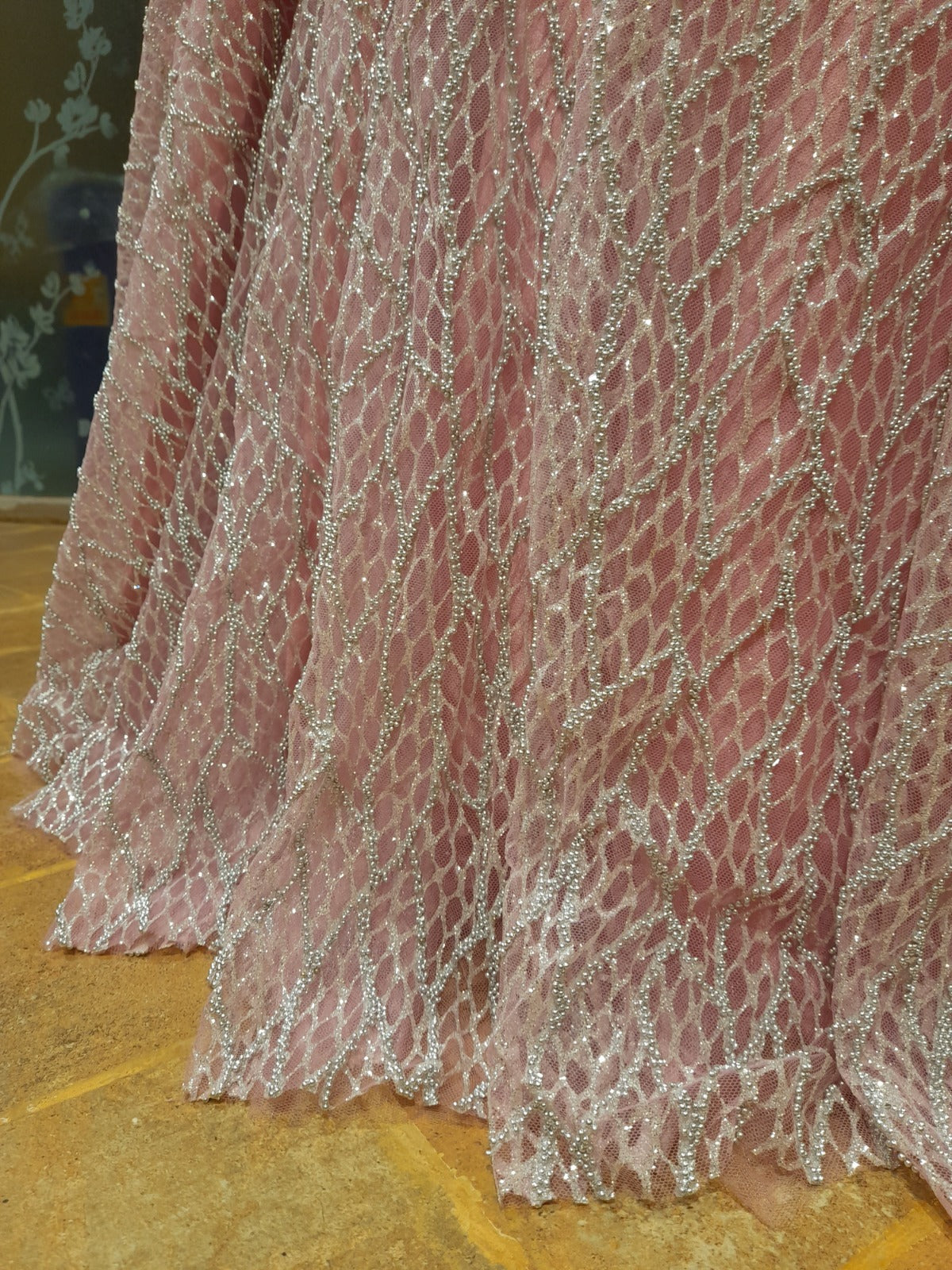 The color is divine—soft blush pink base interwoven with silver metallic threads creating a textured, shimmering surface that catches light like water catching moonlight. The wave-like pattern creates visual movement even when standing still, ensuring the gown photographs stunningly from every angle.