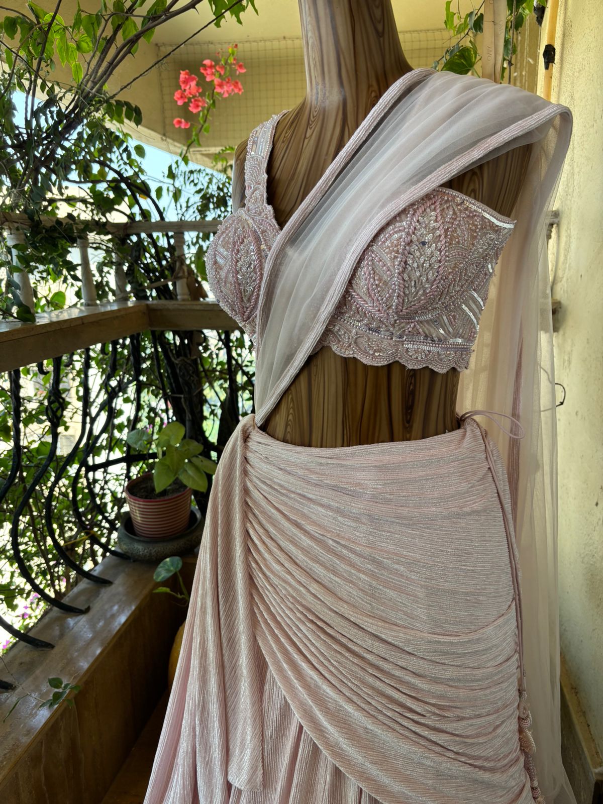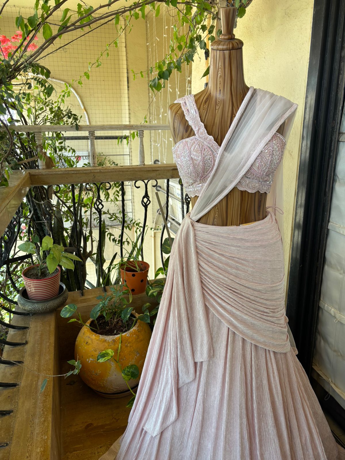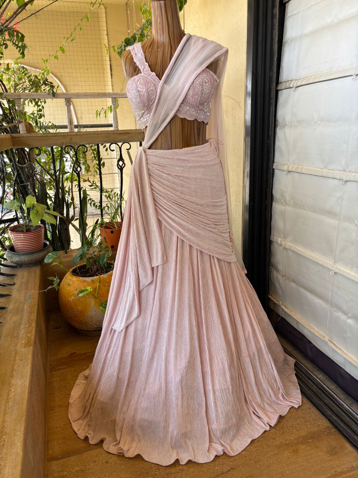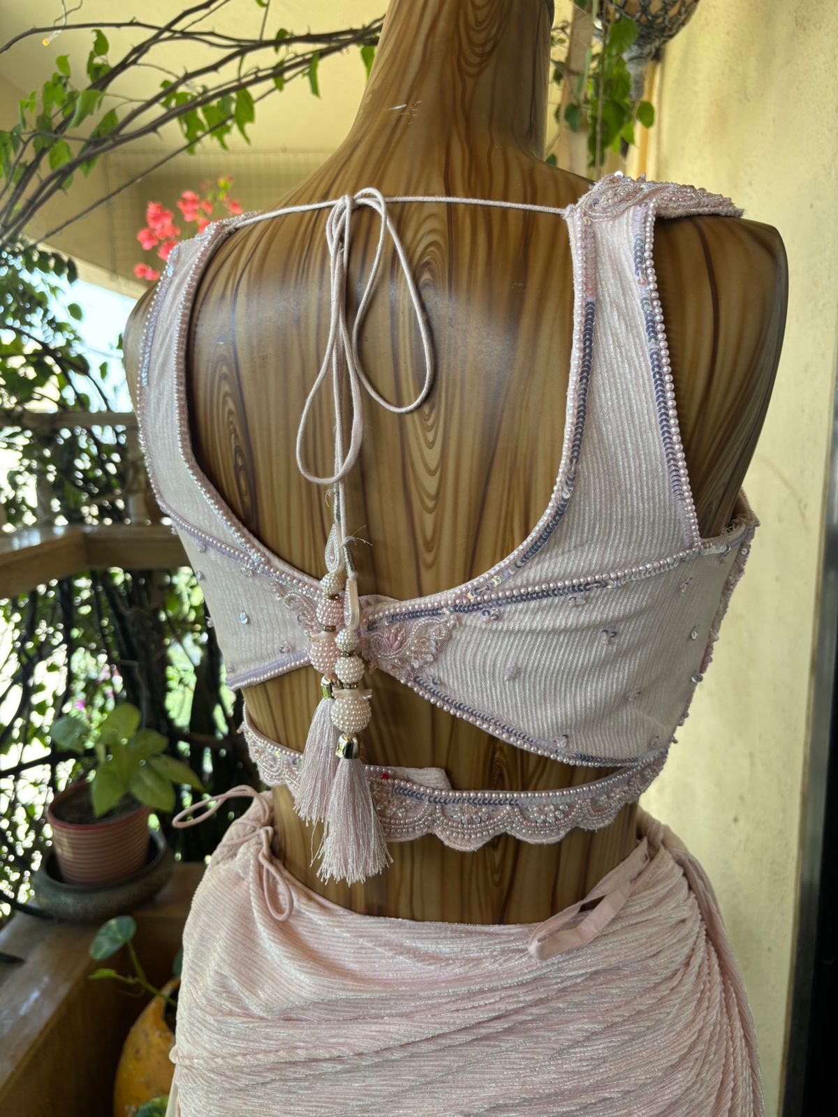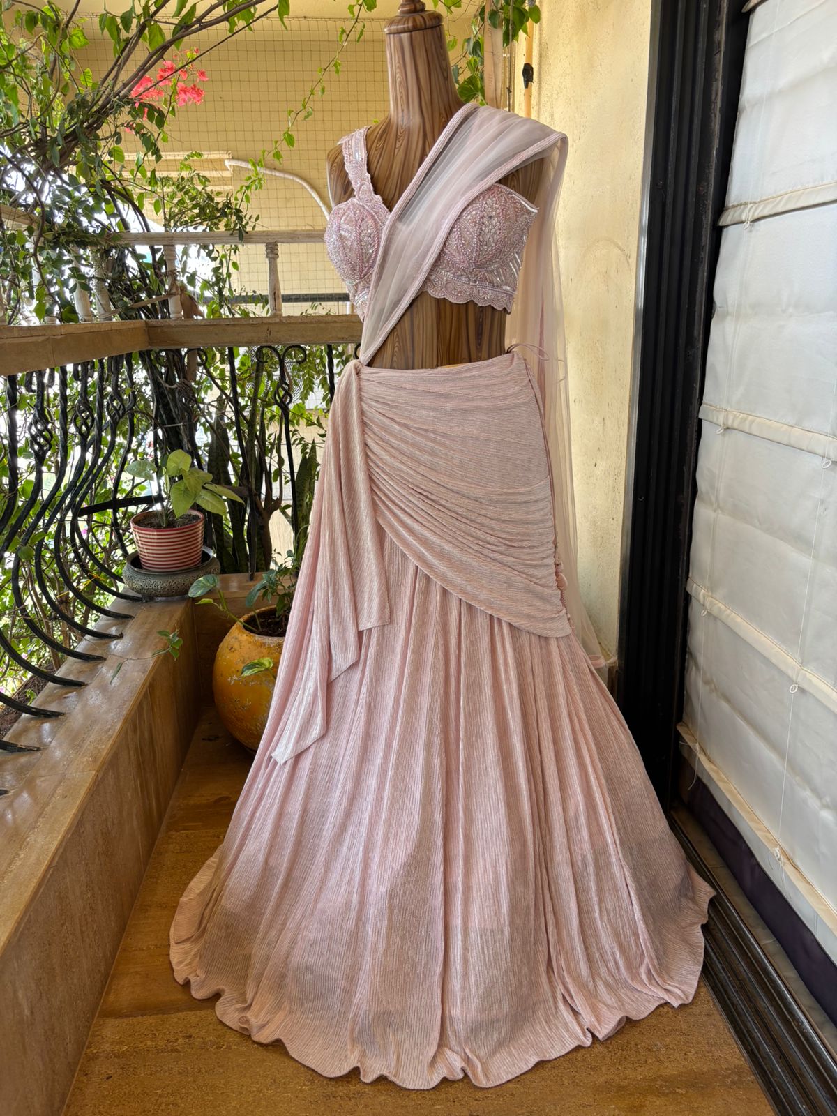 Rendered in a luminous blush silk-blend weave, the silhouette unfolds with effortless fluidity. The embroidered sweetheart blouse, adorned with fine thread and beadwork, creates a sculpted bodice that contrasts beautifully with the cascading pleated lehenga. A diagonally draped dupatta glides across the torso like a veil of light, framing the waist and adding dimension to the minimal aesthetic.