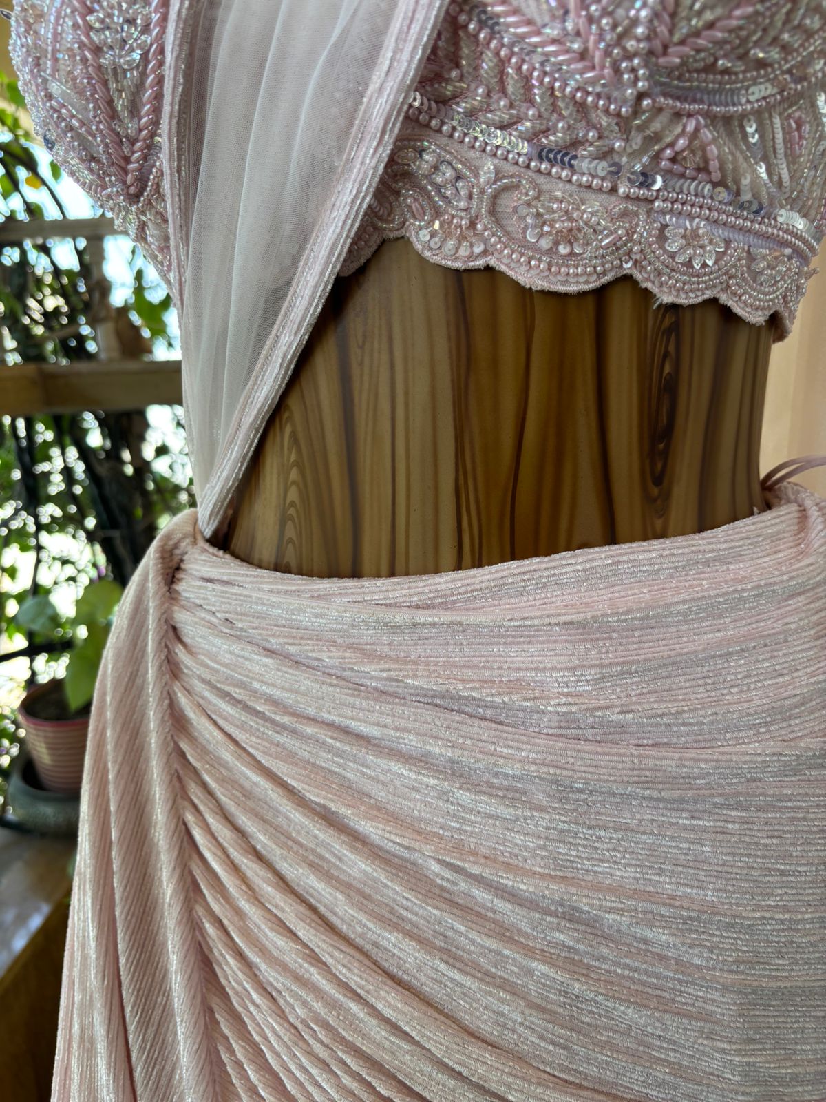 The Blush Veil Éclat ensemble required over 350 hours of meticulous craftsmanship. The challenge lies in achieving perfectly balanced draping—the asymmetric waist panel is hand-constructed to ensure fluid fall and consistent layering. Each embroidered motif on the blouse is individually placed to create soft symmetry, while the pleated skirt is precision-set to maintain permanent structure without stiffness.