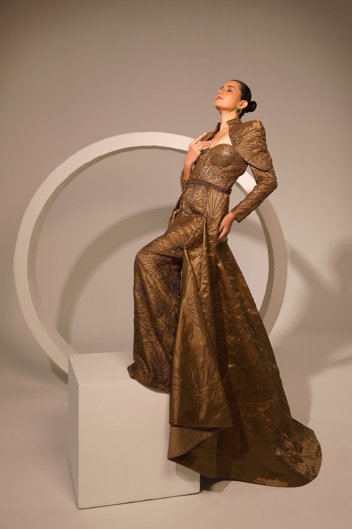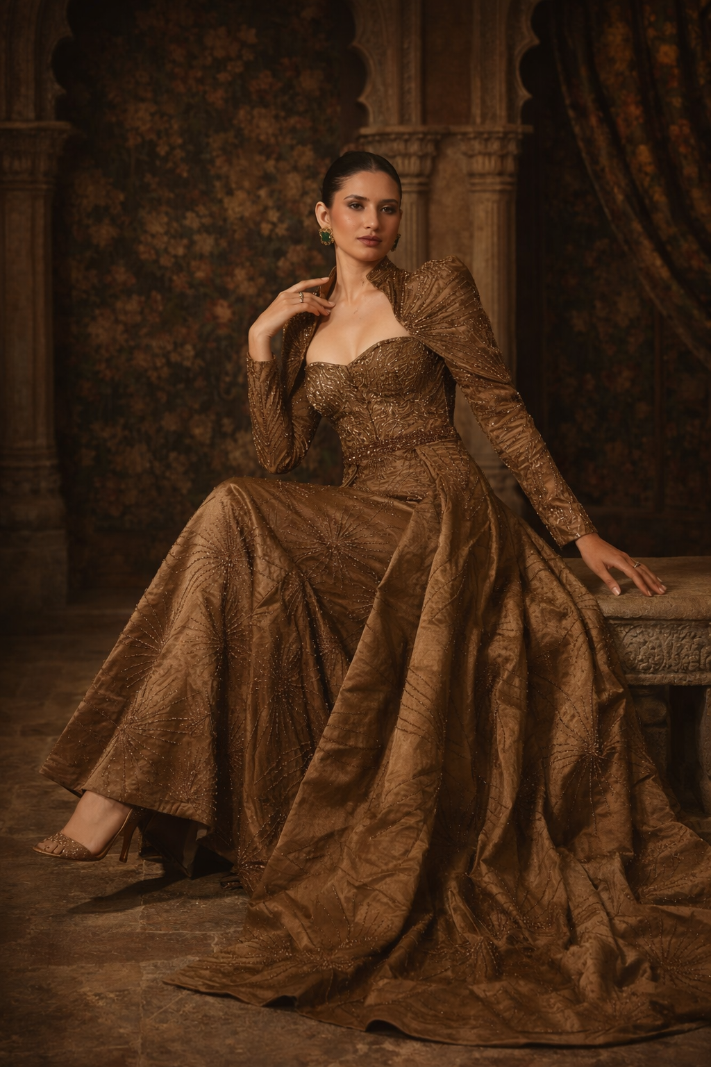 Draped in the richest shade of antique bronze with intricate sunburst embroidery and featuring dramatic puff sleeves that defy convention, this ensemble is for the bride who sees her wedding as her coronation. Who understands that couture is about making statements that echo across time. Who knows that true power dressing means wearing your confidence like armor.
