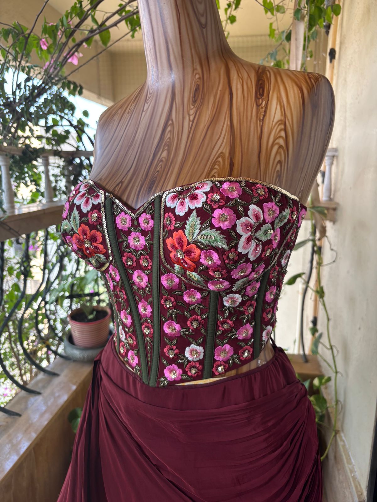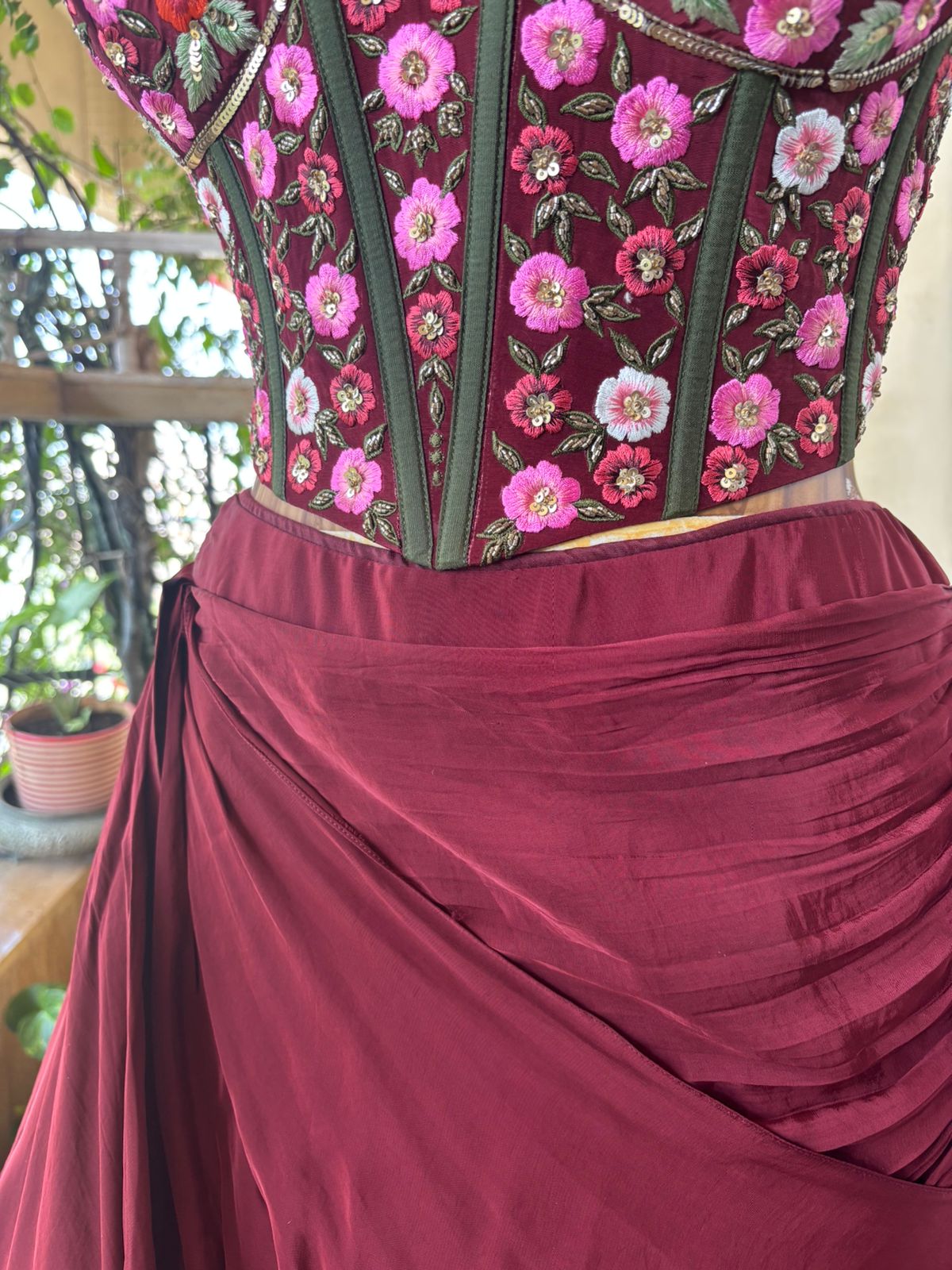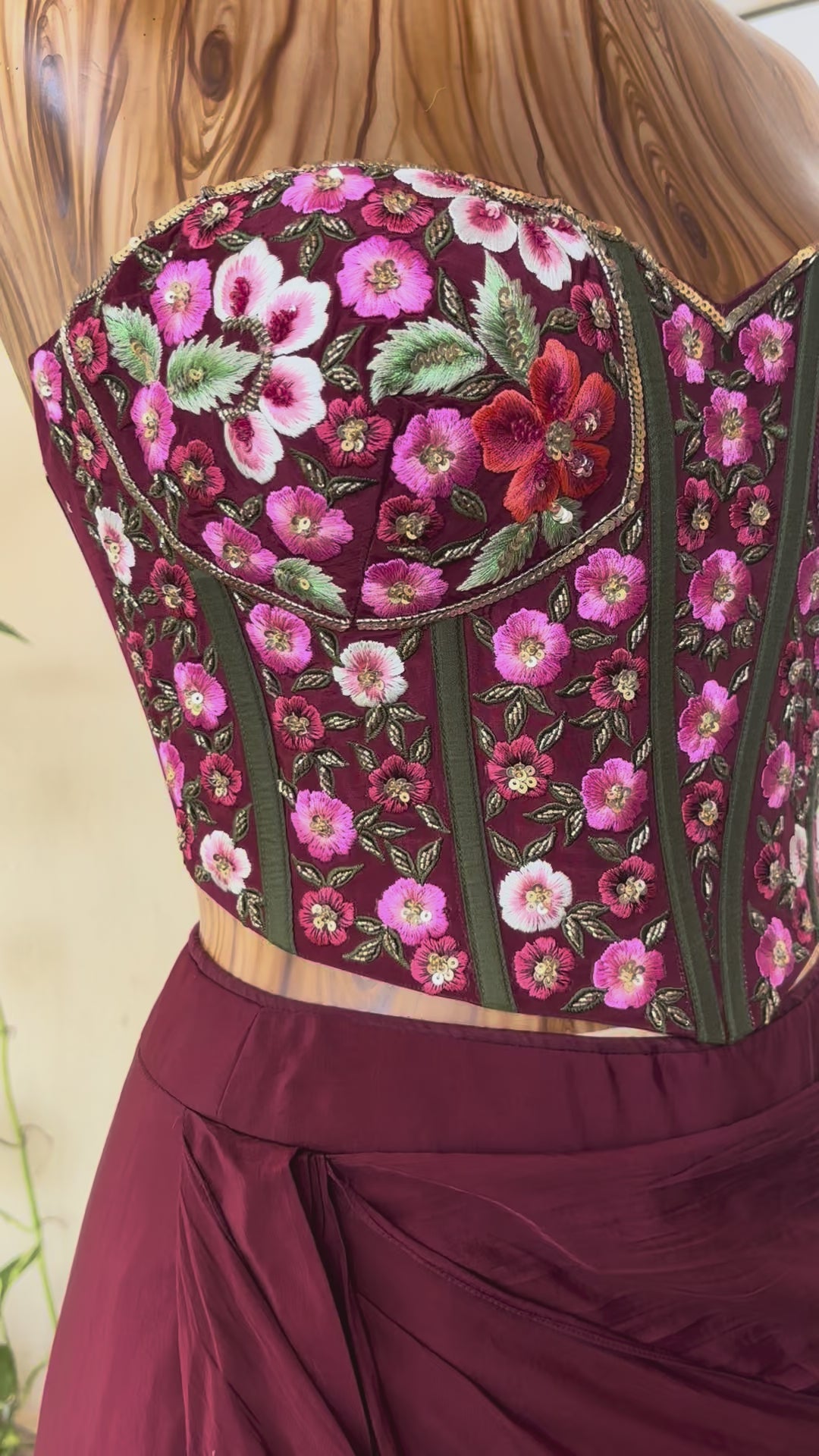 Crafted in a rich burgundy satin base, the lehenga flows with liquid-like fluidity, cascading into sculptural folds that create depth and cinematic movement. The strapless corset blouse, densely embroidered with blooming pink, crimson, and ivory florals, stands as the focal masterpiece—its vertical boning channels echoing classical couture tailoring while celebrating feminine strength.