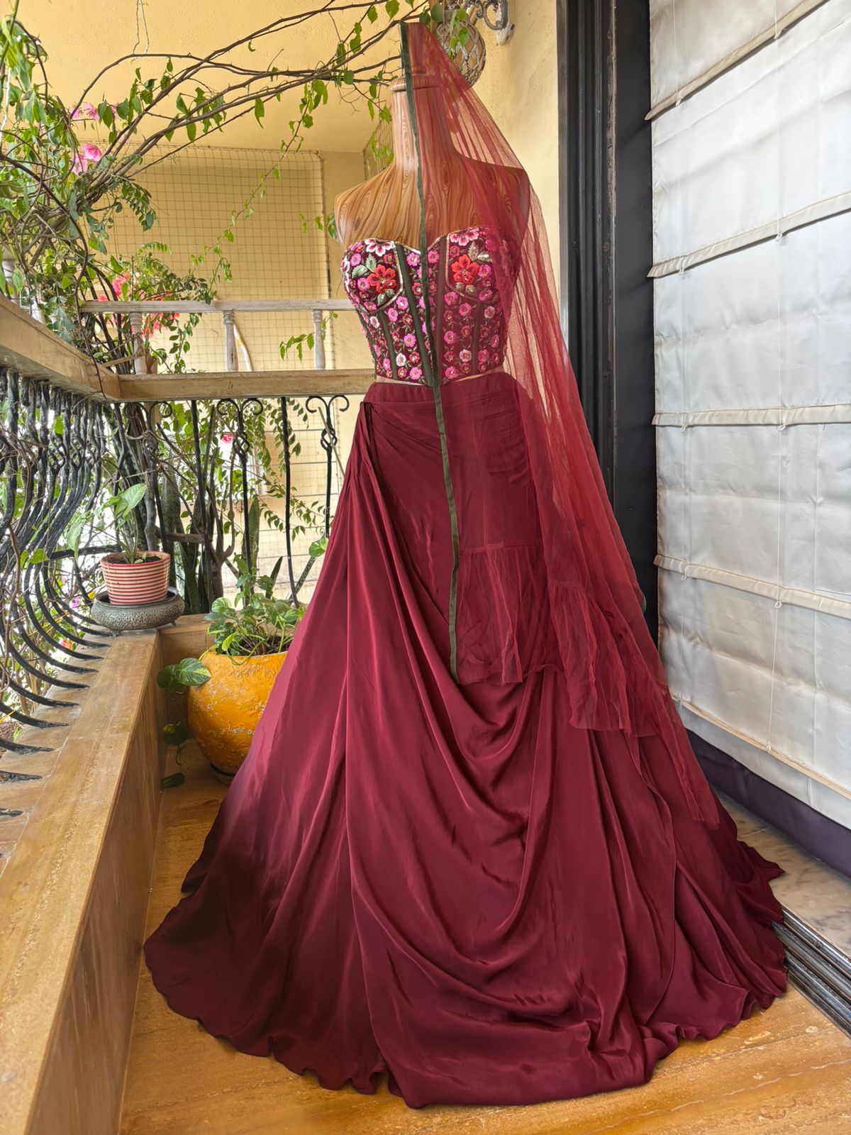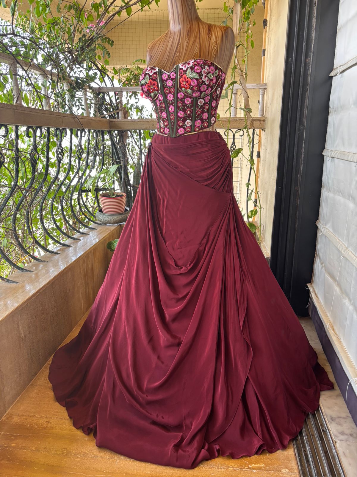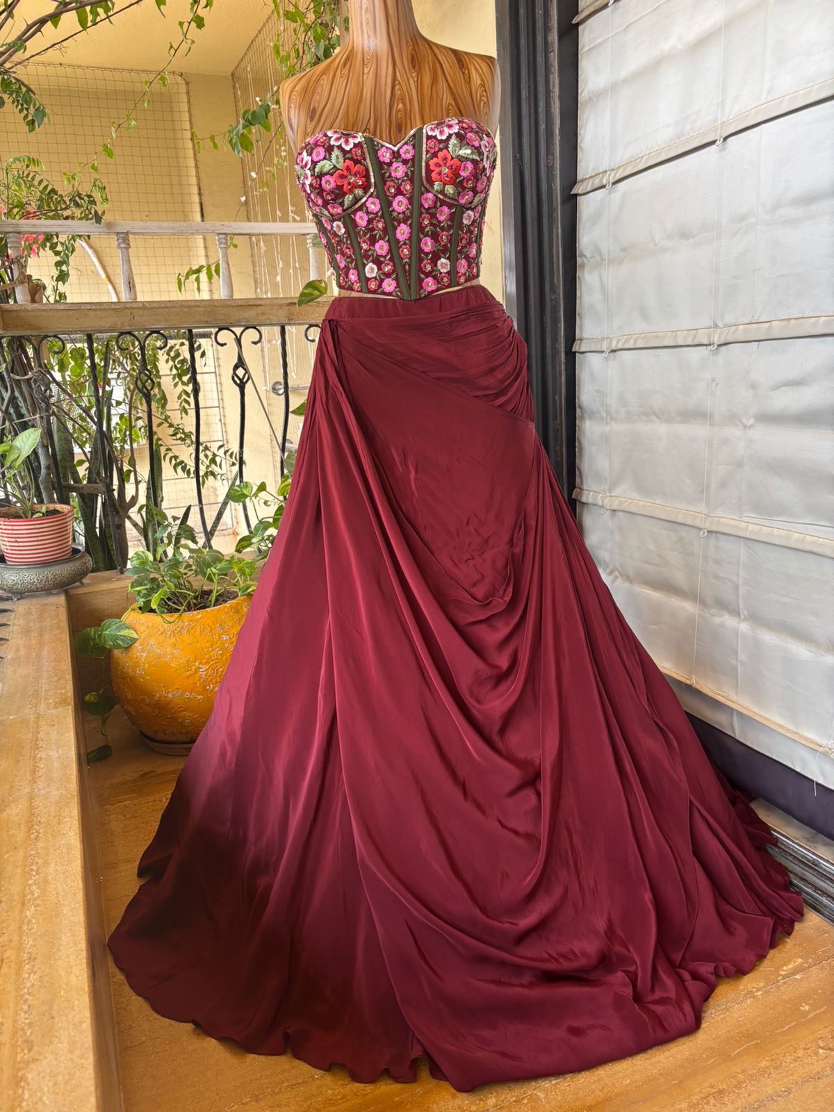Crafted in a rich burgundy satin base, the lehenga flows with liquid-like fluidity, cascading into sculptural folds that create depth and cinematic movement. The strapless corset blouse, densely embroidered with blooming pink, crimson, and ivory florals, stands as the focal masterpiece—its vertical boning channels echoing classical couture tailoring while celebrating feminine strength.