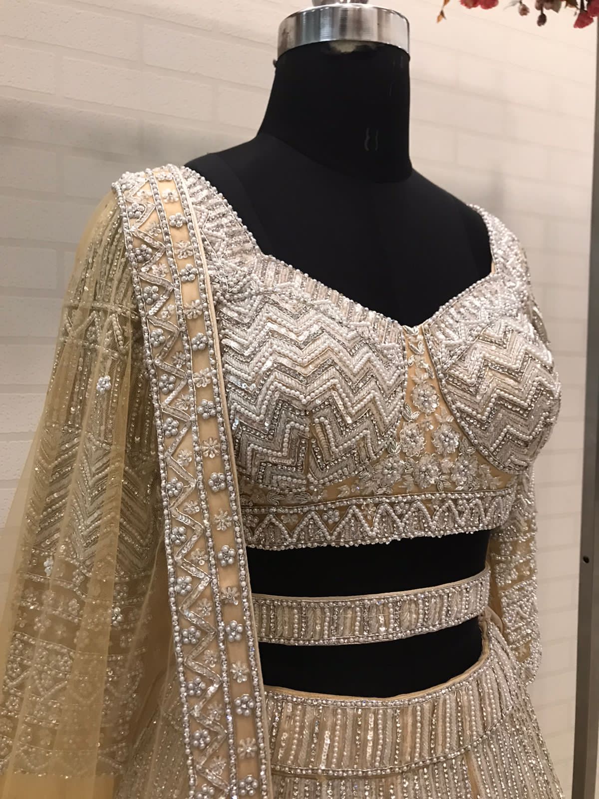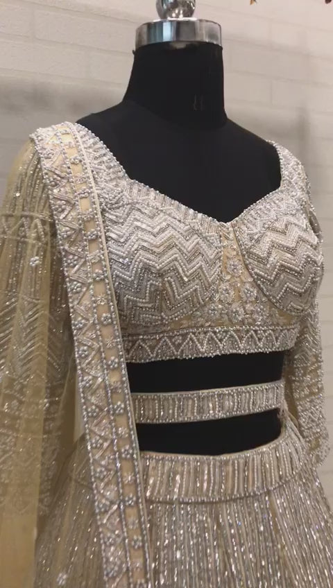 This is a lehenga that whispers luxury in every shimmer, every stitch, every sweep of fabric. Crafted entirely in champagne and silver tones, it's a study in tonal elegance—where subtle variations in shade and texture create depth without relying on bold color contrasts. This is sophistication at its most refined, opulence at its most elegant.