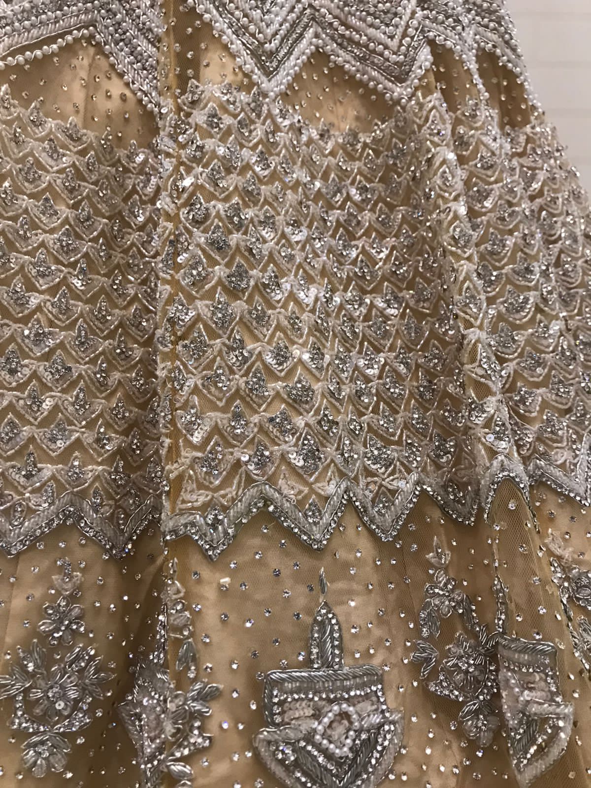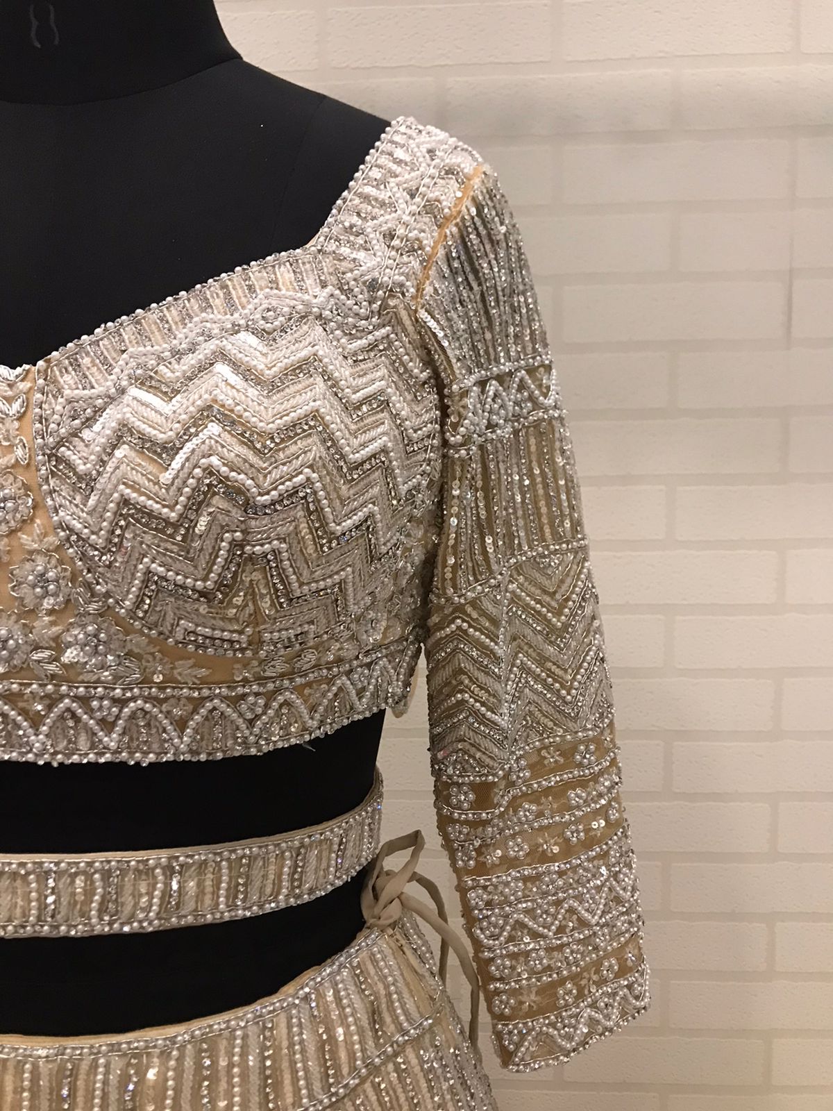 The silhouette is traditional yet refined: a full-sleeved blouse that provides coverage with elegance, a voluminous lehenga that cascades with regal grace, and a sheer champagne dupatta scattered with sequins like stars. Every element has been crafted with meticulous attention to detail and an unwavering commitment to quality.