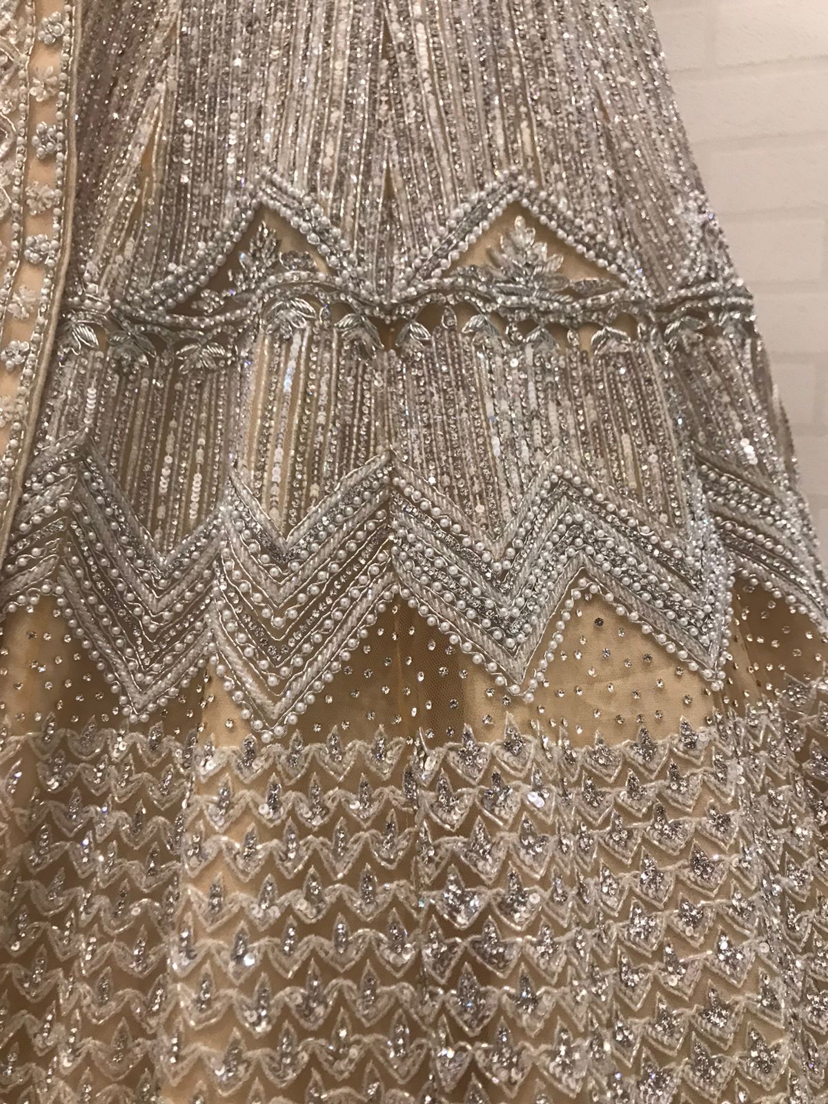 The diamond lattice work creates beautiful texture, with the negative space between the embroidered lines allowing the champagne base to show through, creating depth and visual interest. The lower chevron bands become even more elaborate, with concentrated sequin work that adds weight and presence.