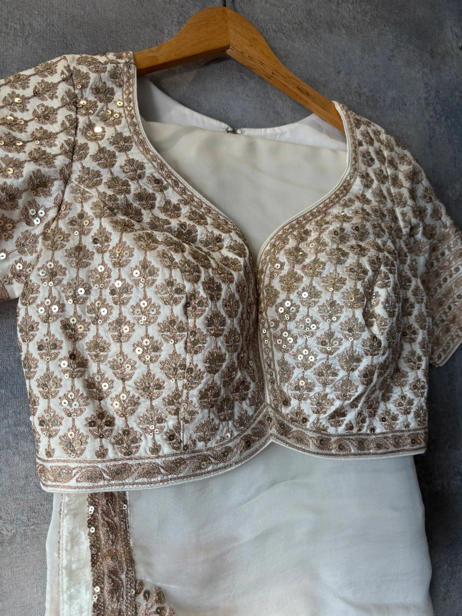 🥂 Matching short-sleeve crop choli with V-neck and hook-eye closure