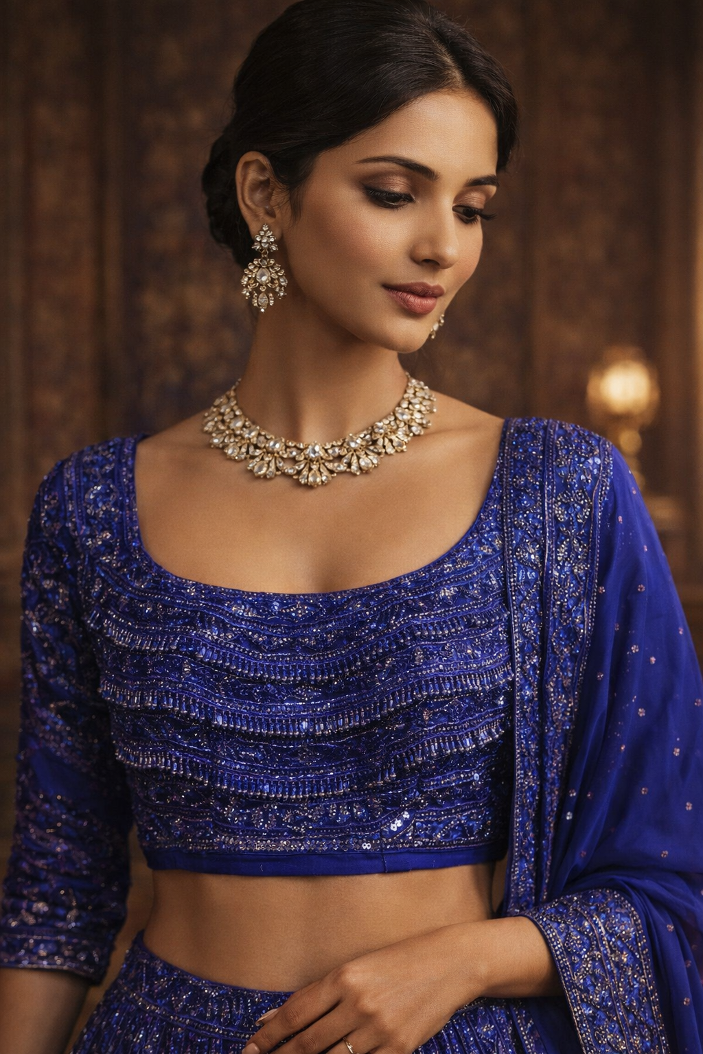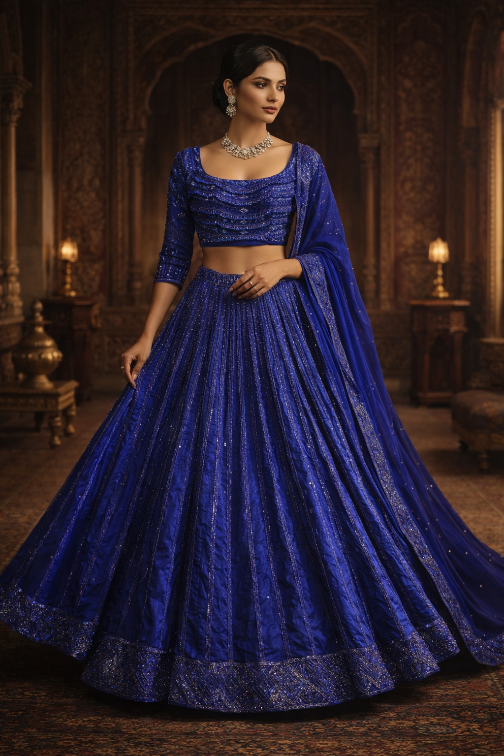 A breathtaking manifestation of liquid energy and rhythmic light, Cobalt Pulse is a masterclass in modern bridal glamour. Designed for the high-octane energy of a Sangeet or a grand Cocktail night, this ensemble celebrates the fusion of architectural structure and fluid movement. It is a silhouette that doesn't just enter a room; it commands it through a sophisticated display of "Electric Luxury."