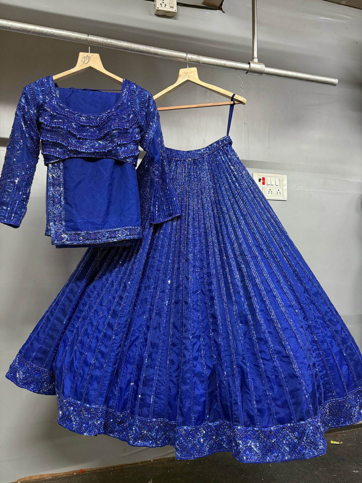 Crafted in a deep, soulful Royal Blue, the ensemble is defined by its rigorous verticality and innovative sleeve architecture. The blouse, featuring dramatic bell sleeves and a rhythmic wave-patterned bodice, acts as a sharp anchor, while the lehenga skirt cascades in a shimmering waterfall of linear sequins that pulse with every beat of the music.