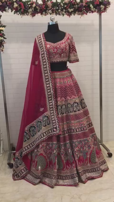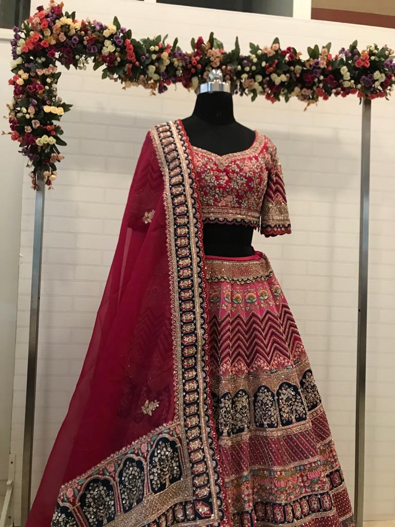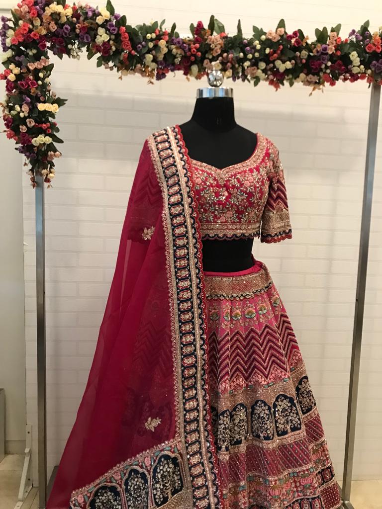 This is the outfit for the bride who finds beauty in the unconventional. It moves beyond the single-color palette, introducing a complex interplay of deep garnet, rose pink, and navy blue accents. The skirt is a study in "Pattern Blocking"—where horizontal tiers of zigzag chevrons collide with architectural Mihrab arches, creating a look that is rhythmic, dynamic, and undeniably couture.