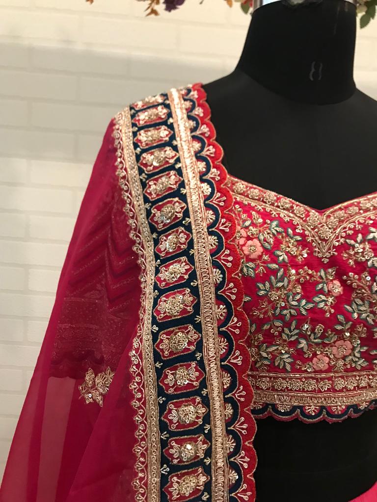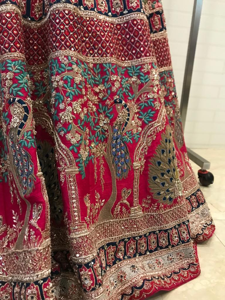 "I was tired of seeing the same floral lehengas everywhere. This felt architectural. The mix of navy and red was so unique, and the copper work glowed in the evening lights." — Pareina L., Mumbai