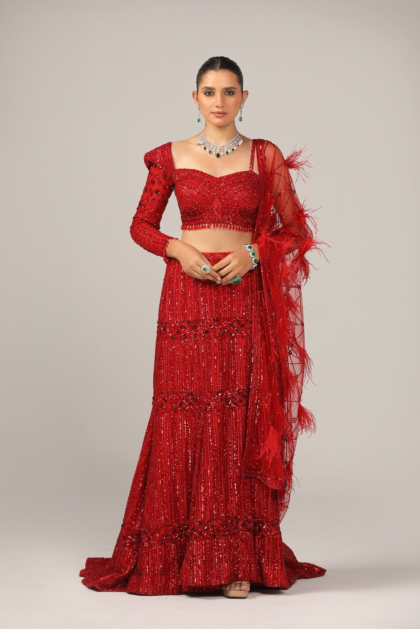 The feathered dupatta adds a touch of avant-garde luxury, softening the structured lines of the lehenga with ethereal movement.