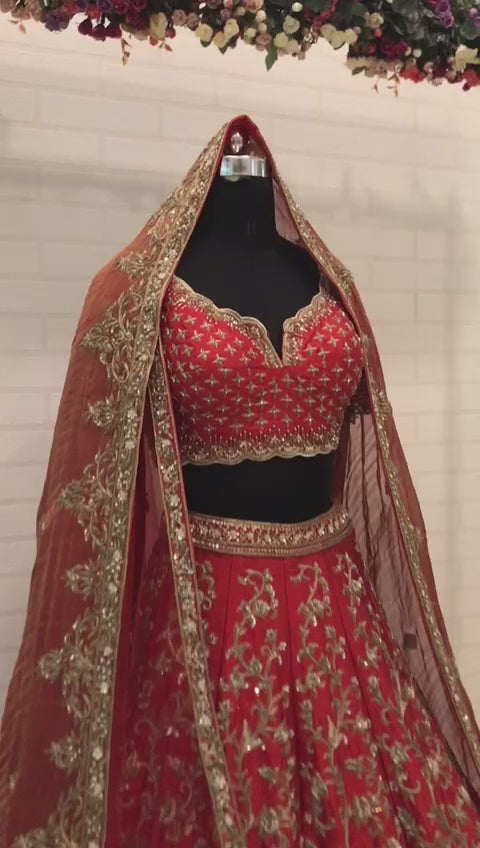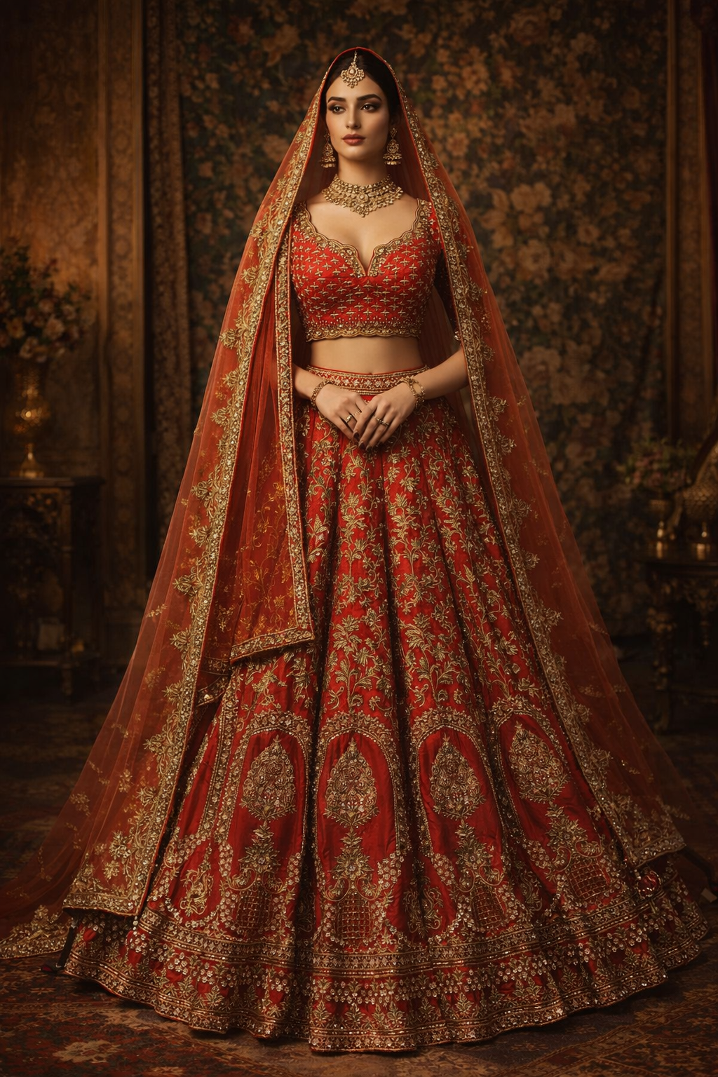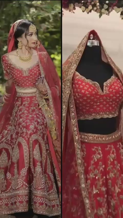 Crafted entirely in rich crimson red with elaborate gold embroidery, the silhouette celebrates traditional motifs, architectural design, and meticulous craftsmanship. The sweetheart-neck blouse glows with dense embellishment, while the lehenga flows with paisley, floral, and arch patterns that create a visual symphony from waist to hem. The dupatta adds dramatic elegance with its heavily embroidered borders and luxurious drape.
