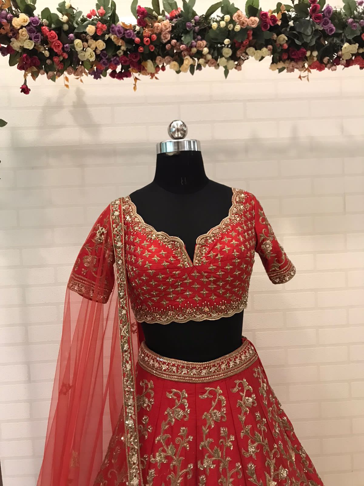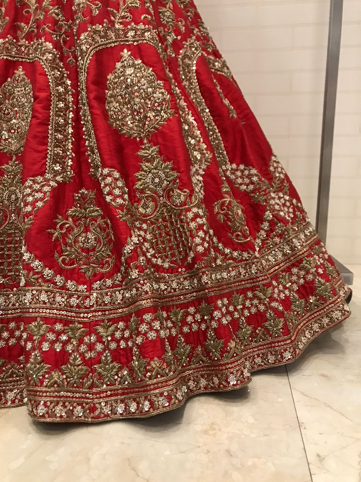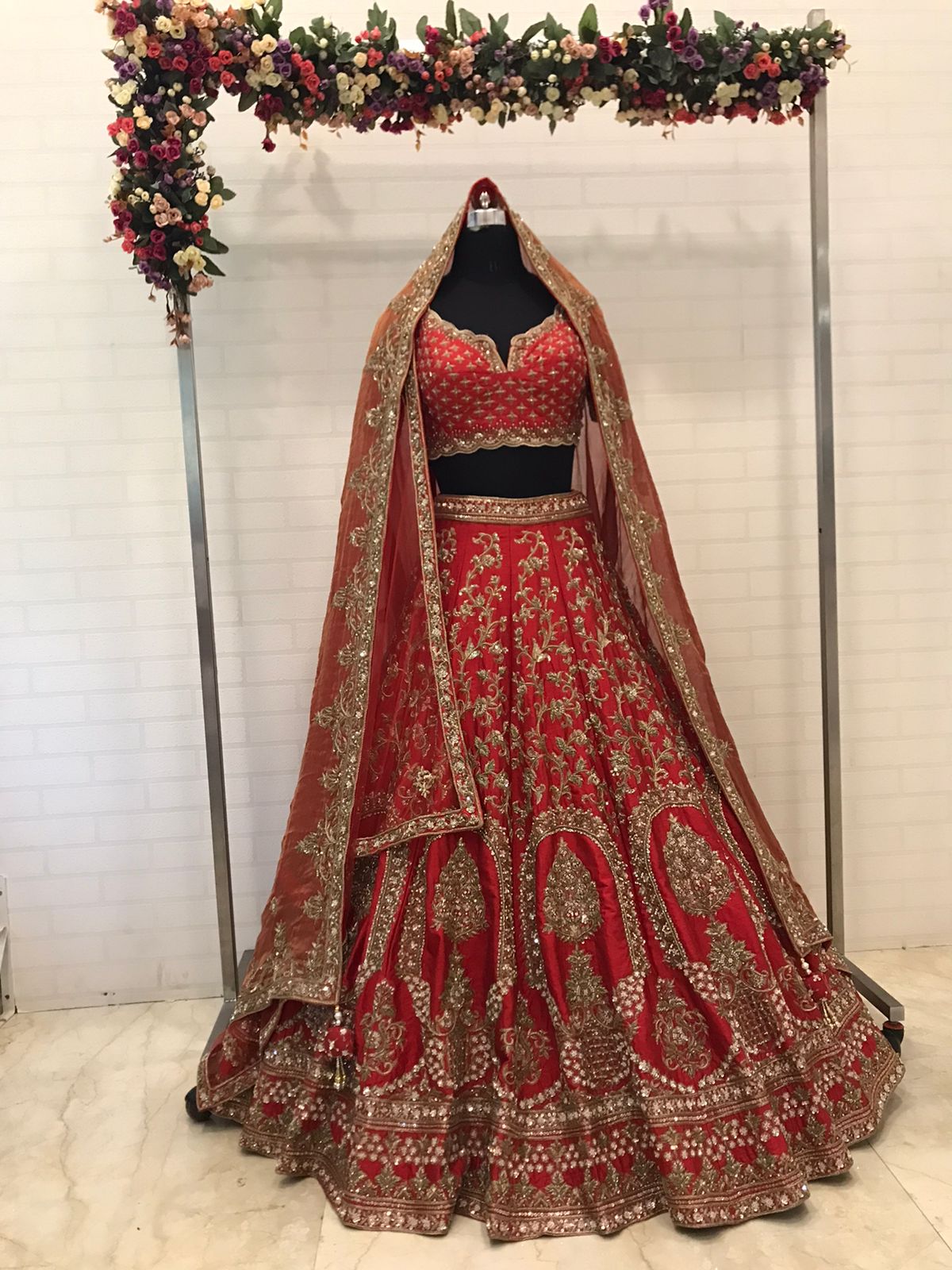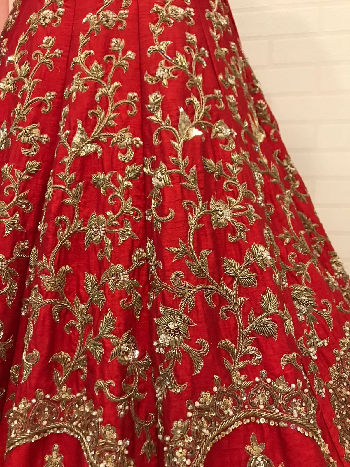 - Rich crimson red base matching the lehenga