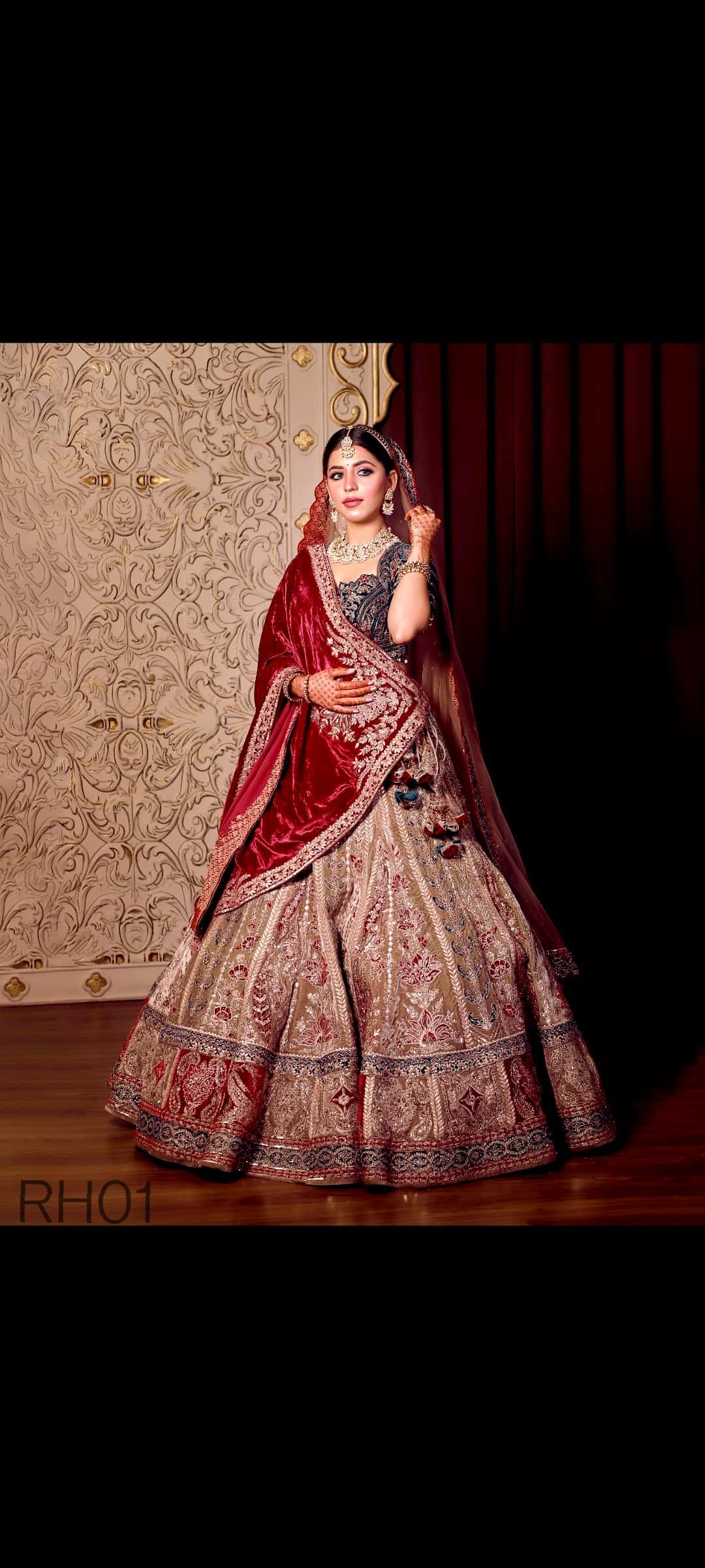 Crafted in a breathtaking palette of antique gold and deep crimson, the ensemble features a dual-textural story. The lehenga, a canvas of high-density gold embroidery, is anchored by a majestic maroon velvet border at the hem, while the addition of a luxurious velvet shawl makes it a definitive choice for grand, cold-weather wedding ceremonies.