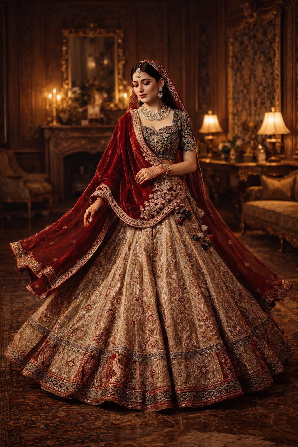 This is not just a lehenga; it is a wearable piece of architecture—designed to reflect the glow of a thousand candles and the weight of a royal lineage.