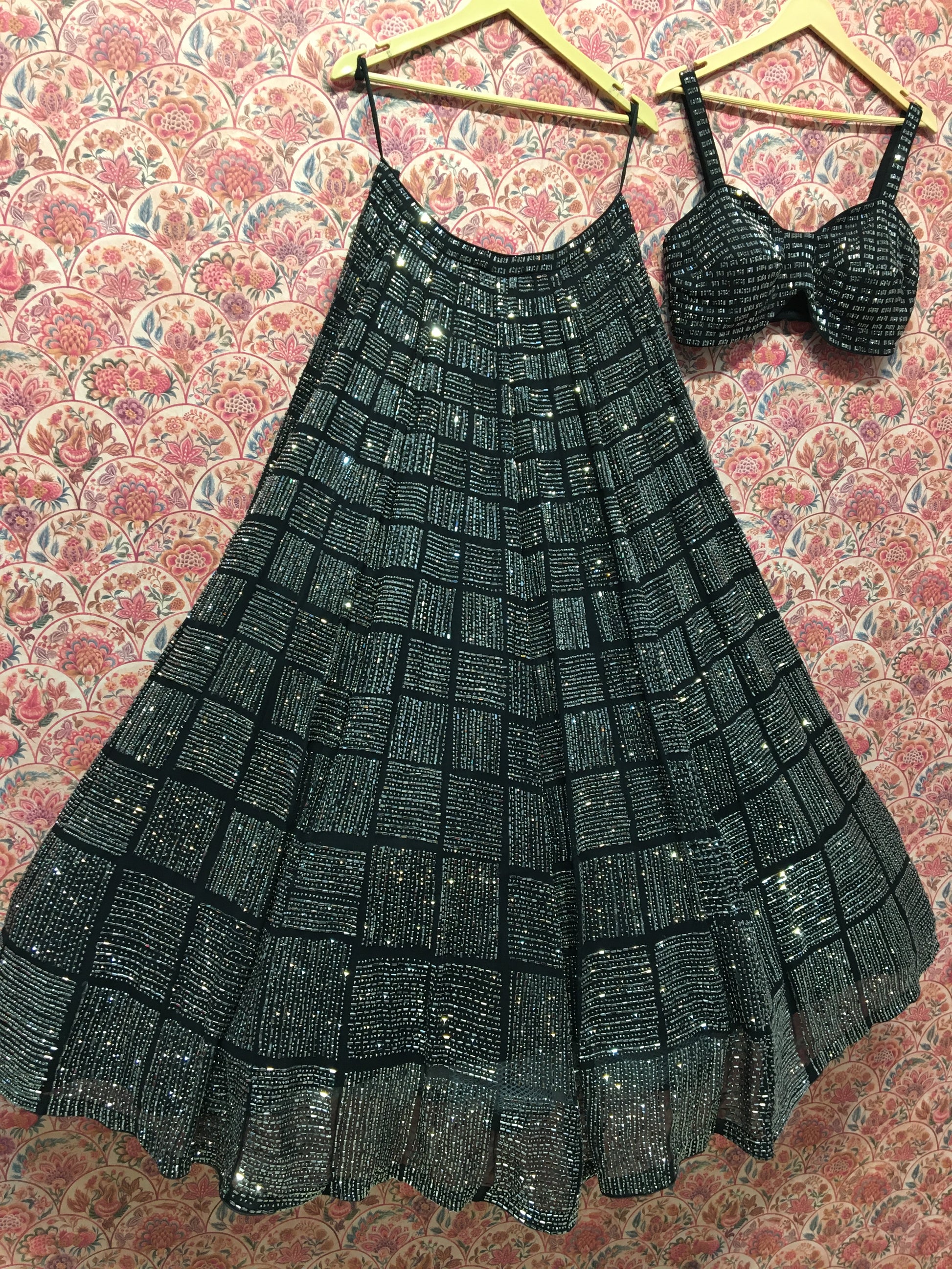 The magic? The bustier corset top with geometric sequin paneling paired with a fully sequined lehenga skirt in tiered architectural rows. Under sangeet lighting (which, let's be honest, is designed for exactly this kind of drama), you won't just sparkle—you'll create your own gravitational field of attention.