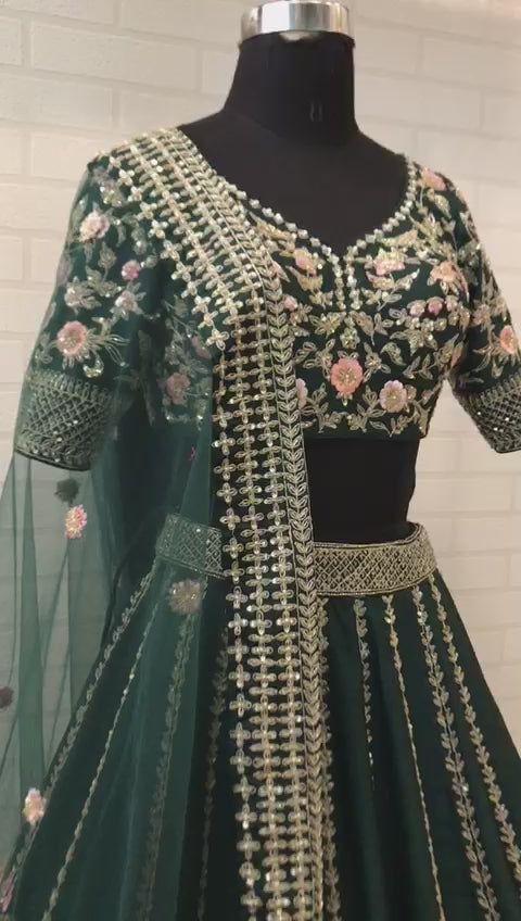 The silhouette is classic and structured: a fitted blouse adorned with floral embroidery and edged in golden gota work, sleeves that balance coverage with elegance, and a voluminous lehenga that cascades with dramatic flair. The dupatta—sheer emerald net scattered with florals and bordered in intricate gota detailing—adds layers of grace and movement.