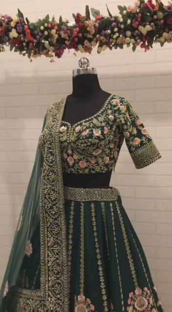 The lehenga is where the story unfolds—a canvas of emerald green brought to life with gardens of embroidery.