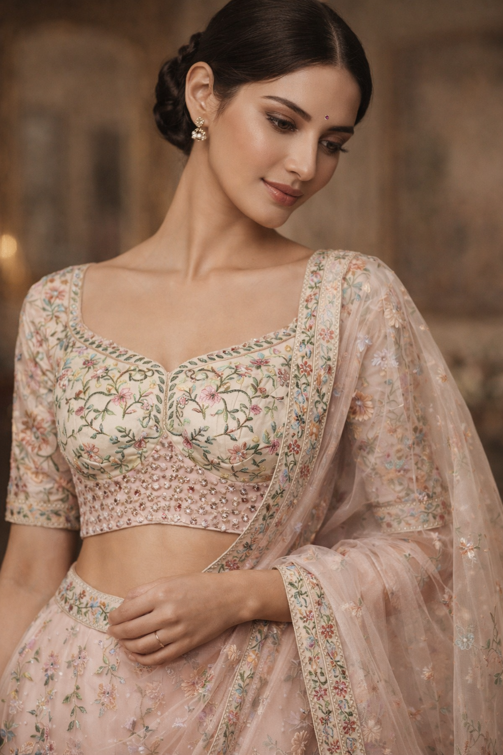 The blouse acts as a jeweled anchor, reflecting a soft, internal light that highlights the bride’s natural glow and festive floral jewelry.