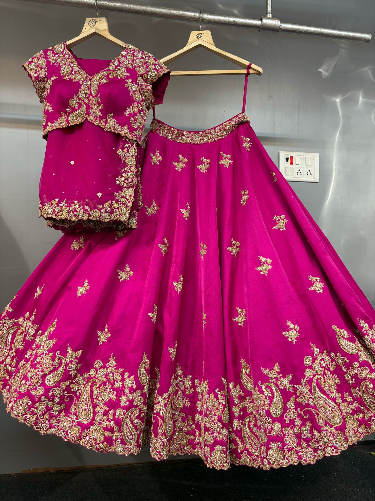 Crafted in a signature shade of imperial fuchsia, the ensemble is defined by its meticulous paisley (kalka) and botanical embroidery. The blouse, featuring a modern architectural inverted-V hem and a sharp V-neckline, acts as a jeweled anchor, while the voluminous lehenga skirt features a grand landscape of hand-sewn floral vines and majestic paisley motifs that shimmer with every turn.