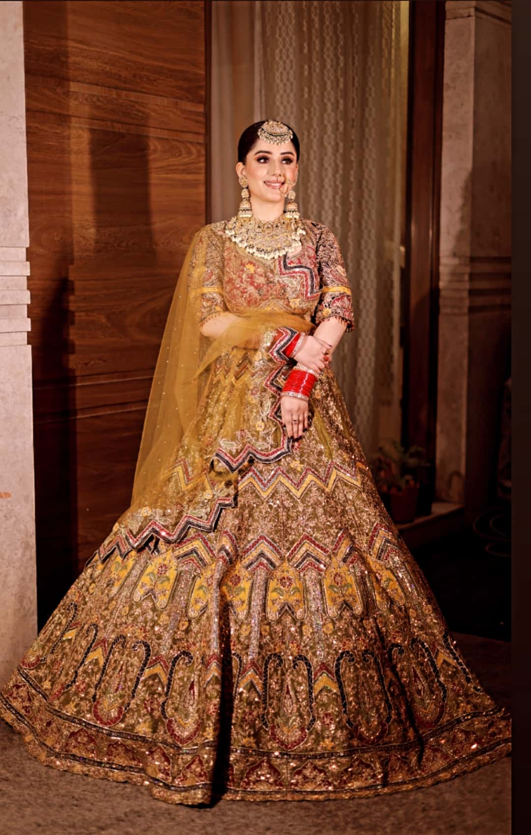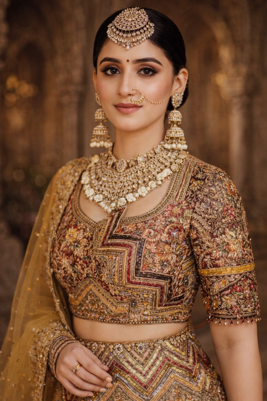 The blouse provides a grounded, regal frame, using the warmth of mustard-gold to highlight the bride’s natural glow and heavy bridal jewelry.