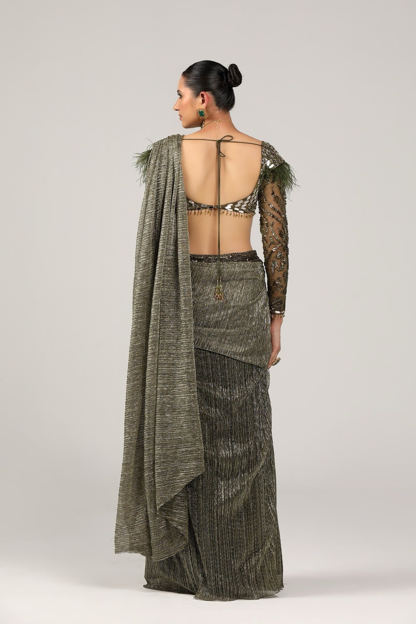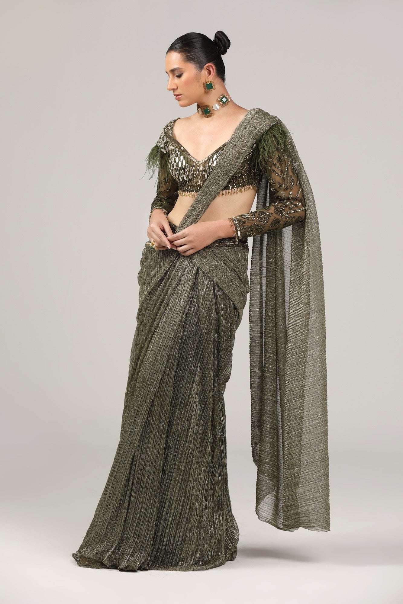 The "Gilded Moss" represents over 150 hours of hand-embellishment. The mirror-work is executed using a "shadow-stitch" technique to ensure each reflective piece is flush against the fabric. The metallic pleating of the saree is achieved through a specialized heat-set process, ensuring the crinkle texture remains permanent and vibrant, while the feathers are individually ethically sourced and hand-applied to create a seamless, organic volume at the shoulders.
