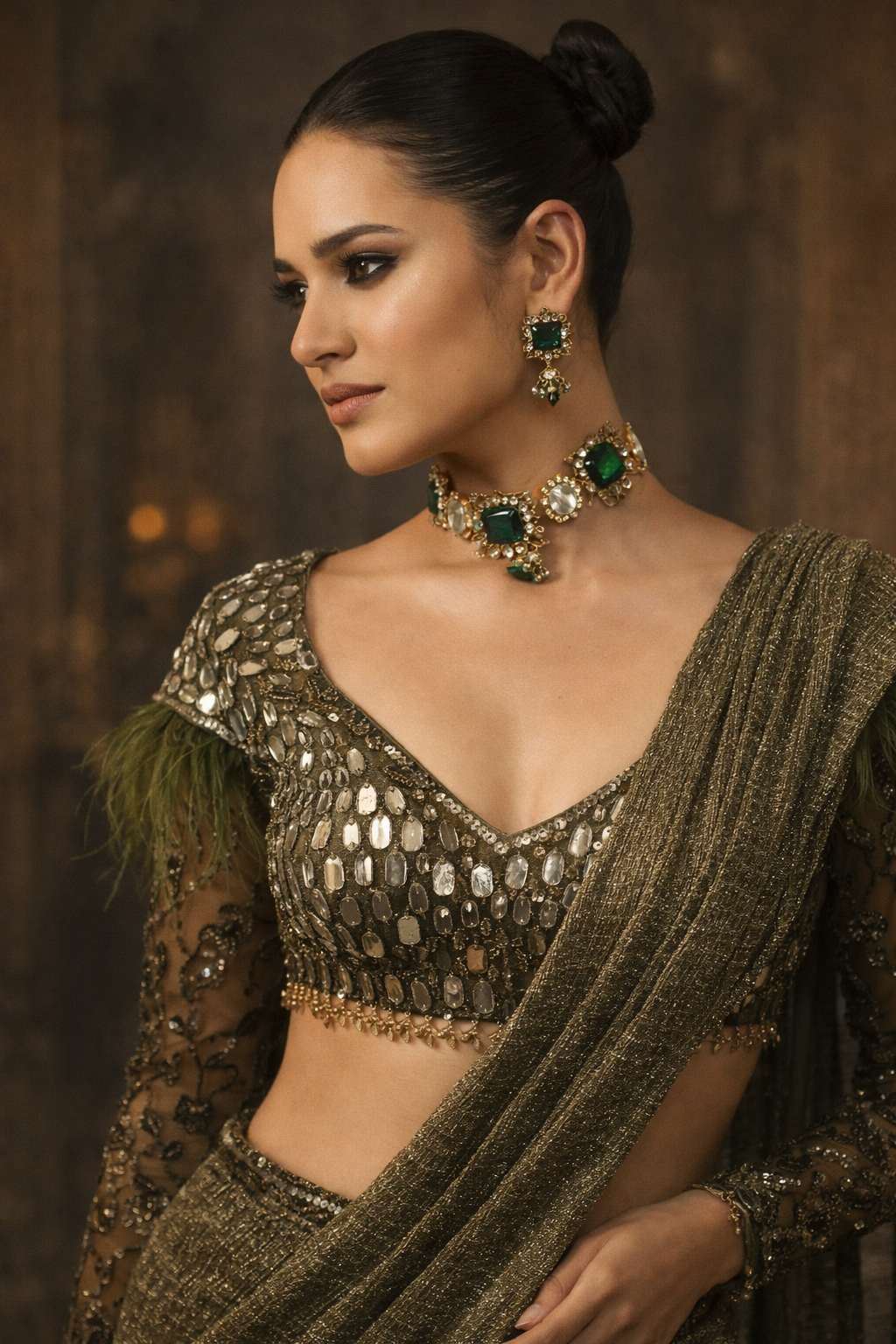 A ripple of liquid emerald and antique gold, Gilded Moss is a masterpiece of texture and light. Designed for the high-octane energy of a grand Sangeet or a black-tie cocktail evening, this ensemble merges the traditional elegance of a saree with the sharp, avant-garde edge of modern couture. It is a silhouette that breathes movement, reflecting every flash of light with a metallic, moonlit glow.