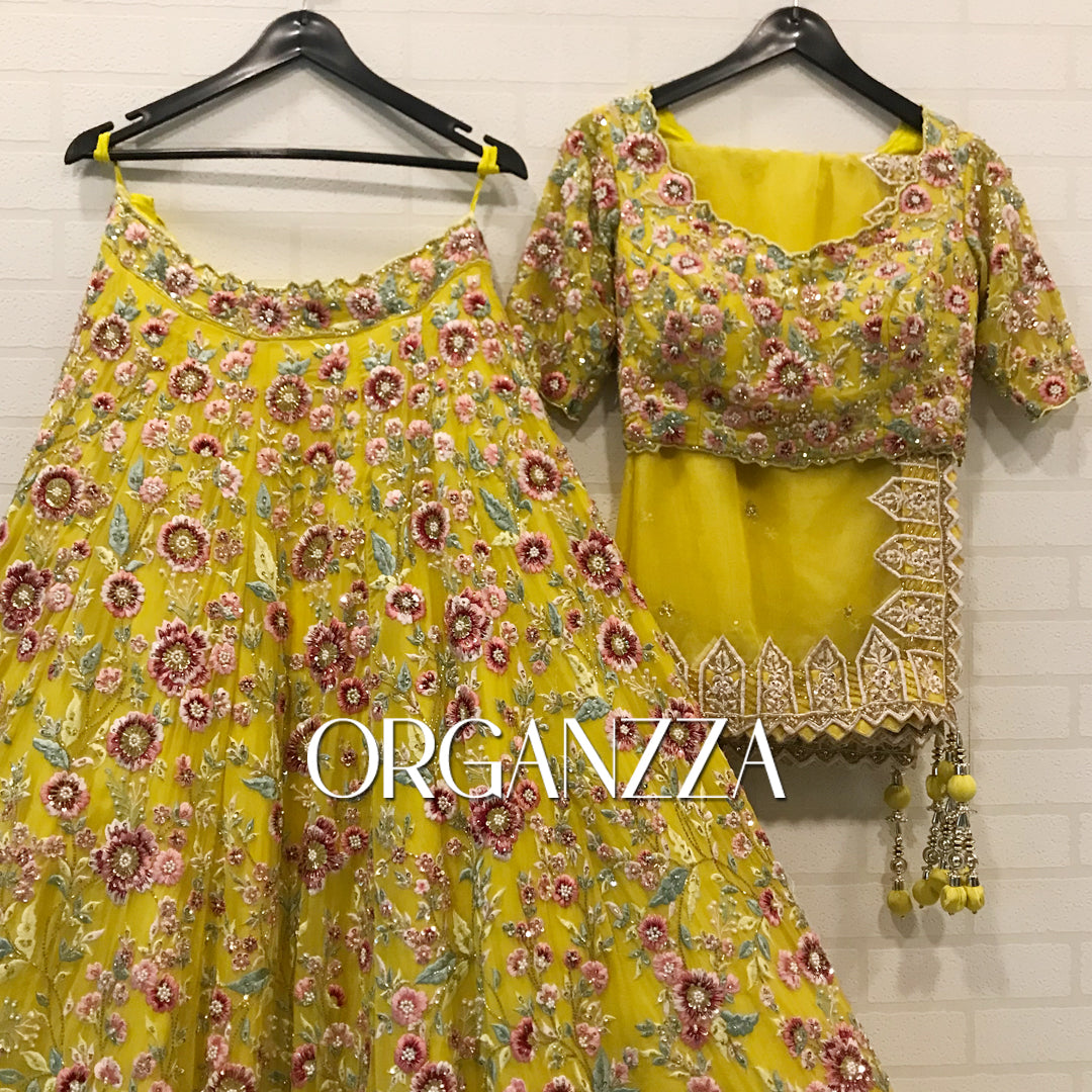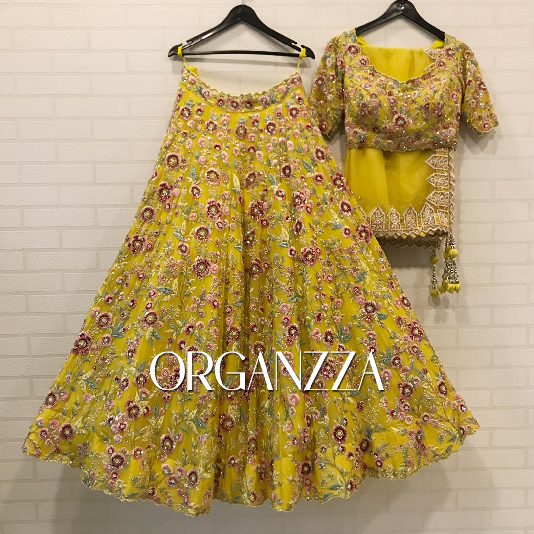 Designed entirely in luminous yellow with elaborate multi-colored floral embroidery, the silhouette celebrates organic beauty, scattered garden patterns, and dimensional embellishment. The short-sleeved blouse glows with dense floral work and scalloped edges, while the lehenga flows like a blooming garden—every inch adorned with flowers in varying sizes, colors, and techniques. The dupatta adds sophisticated contrast with its geometric borders and coordinating yellow base.