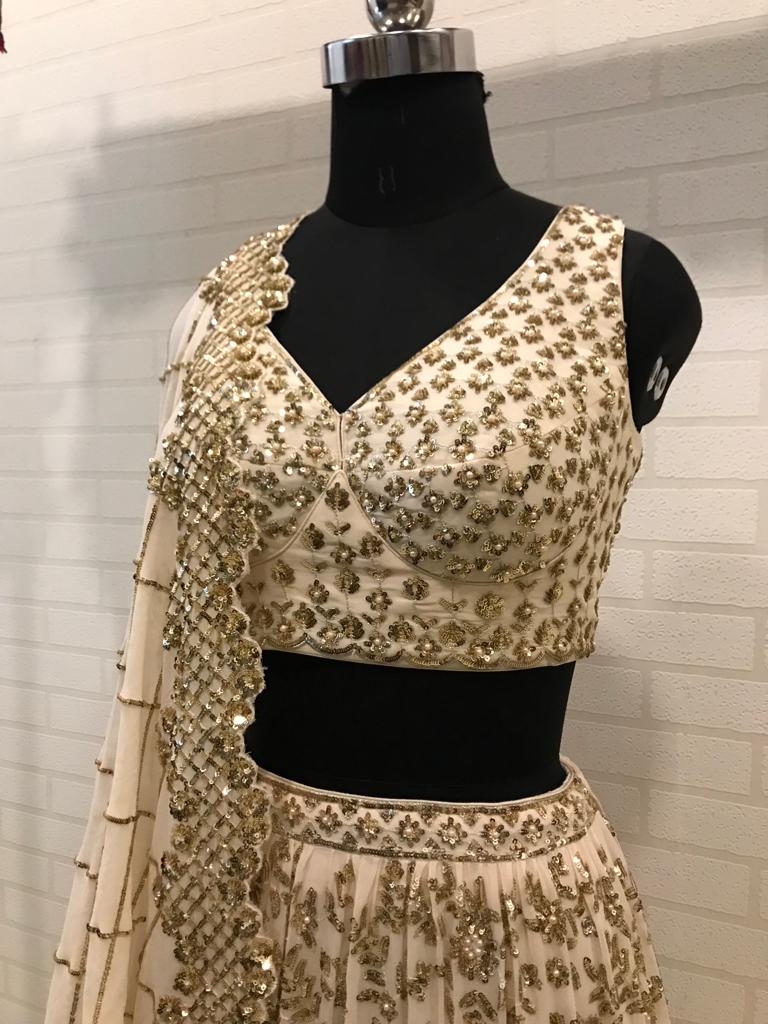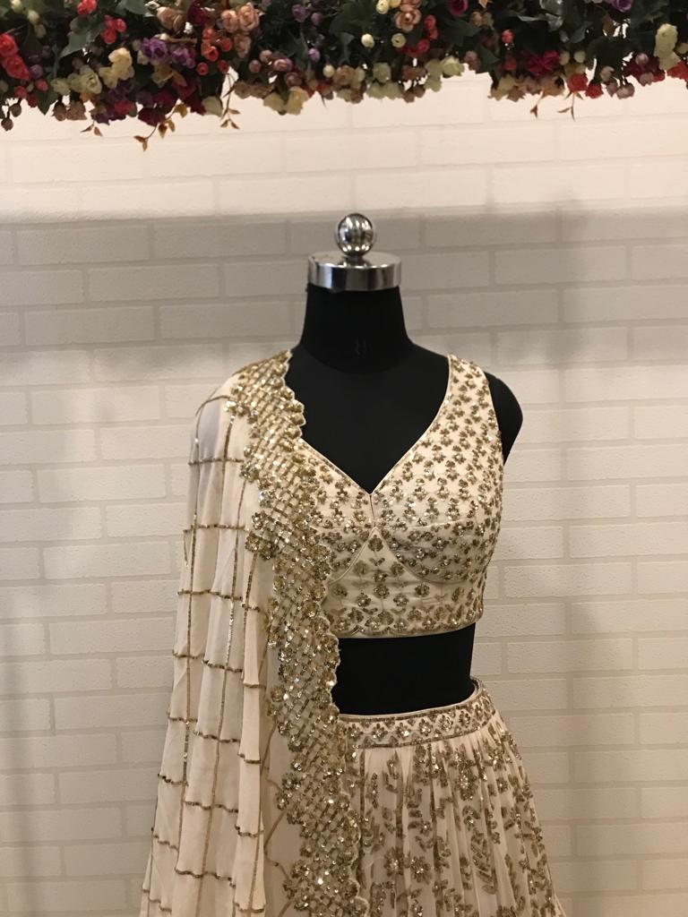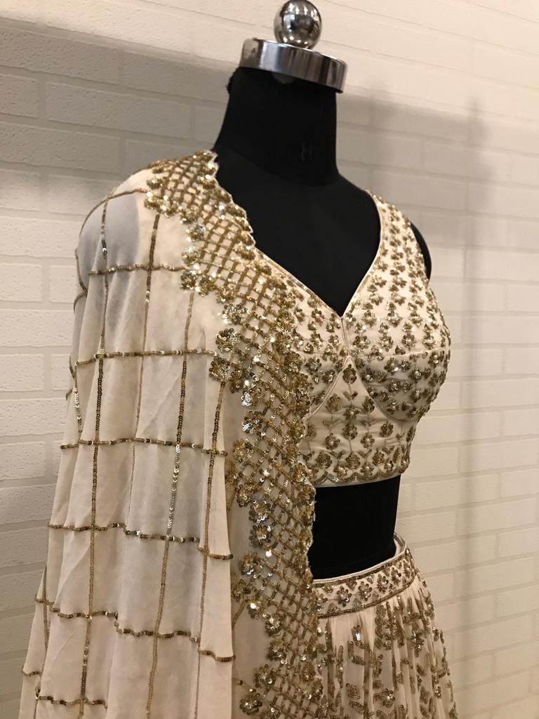 The silhouette is classic yet contemporary: a fitted blouse that sculpts and celebrates, a lehenga that cascades like liquid gold, and a dupatta that moves like a whisper of silk against skin. Together, they create an ensemble that feels both regal and effortlessly modern—a piece that belongs equally at a grand engagement, an intimate reception, or a sunset ceremony by the sea.