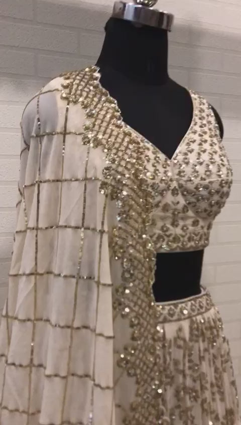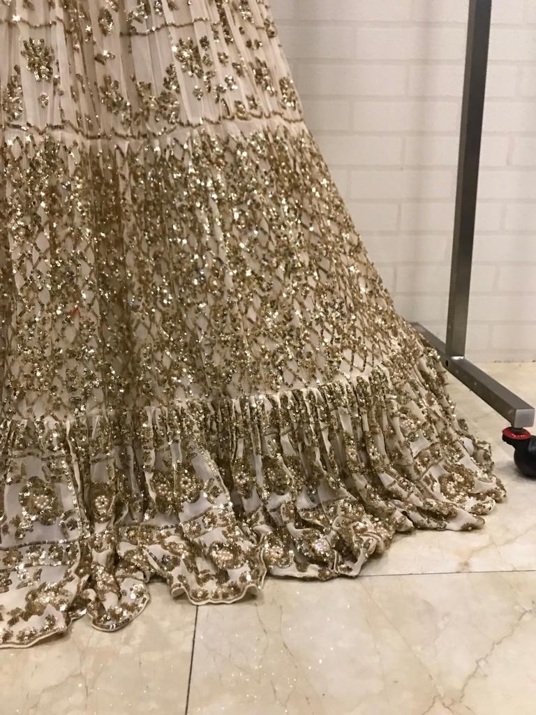 This is not merely a lehenga. It is a symphony of light, texture, and movement—a masterpiece where champagne tones meet molten gold, where sequins become stardust, and where every panel tells a story of patience, precision, and unparalleled artistry.