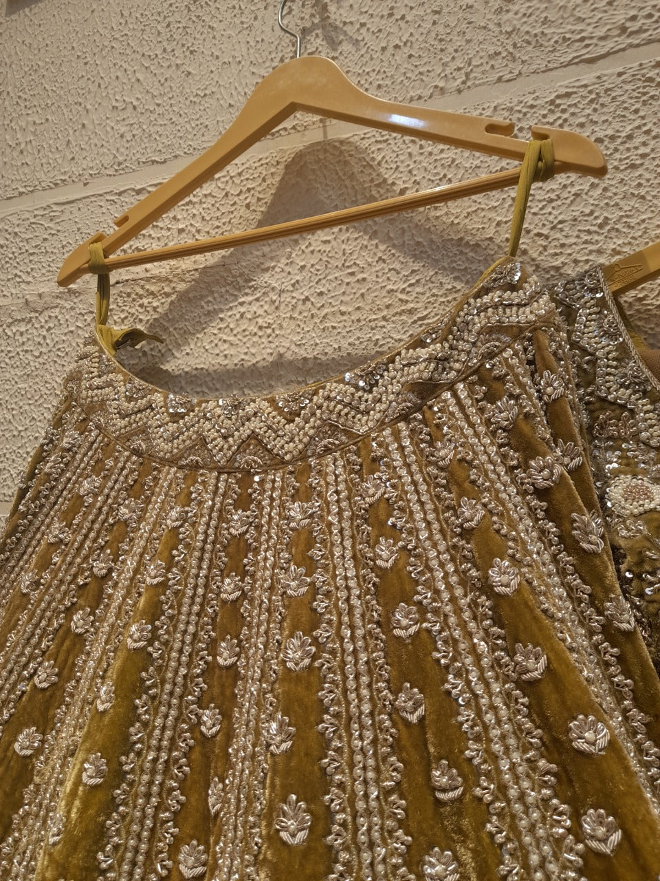Golden Reverie is the result of over 300+ hours of cumulative artisan work. Each element—blouse, lehenga, dupatta—passes through multiple hands, each adding their signature technique.