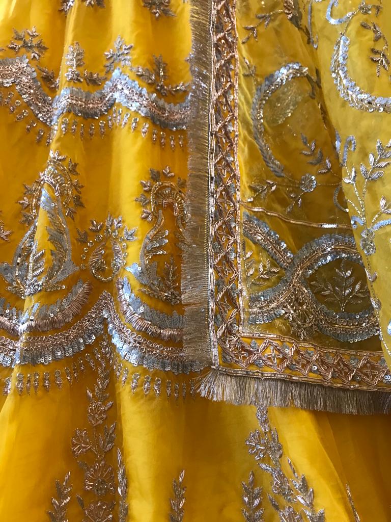 The Mixed-Metal Magic: Unlike standard yellow-on-yellow outfits, Haldi Noor integrates silver and antique gold threadwork. This dual-tone embroidery creates a unique shimmer that pops beautifully against the warm marigold base in daytime photography.