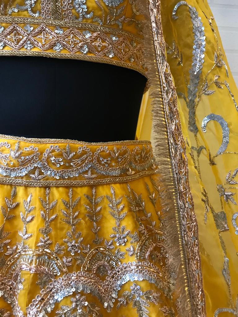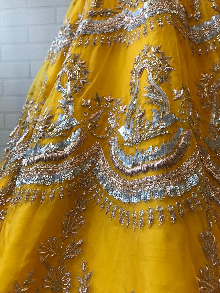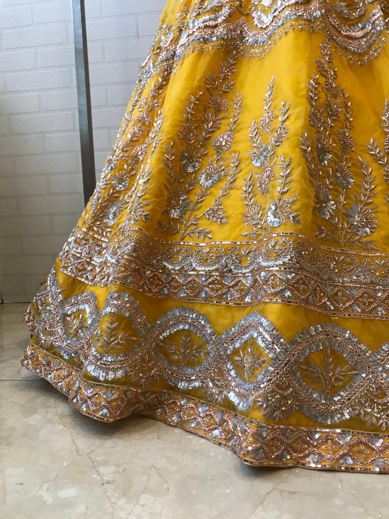 A celebration of sunlight, ritual, and radiance—Haldi Noor is crafted for moments soaked in joy. While the Haldi ceremony is often associated with playfulness, this ensemble elevates it to the realm of high couture. Drenched in a rich marigold yellow, this lehenga captures the golden hour of the wedding timeline.