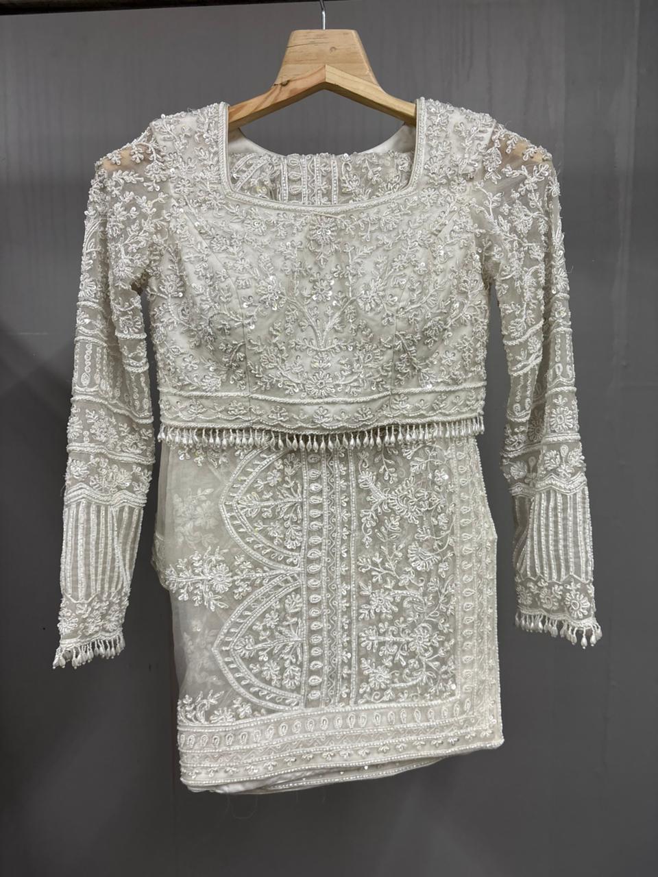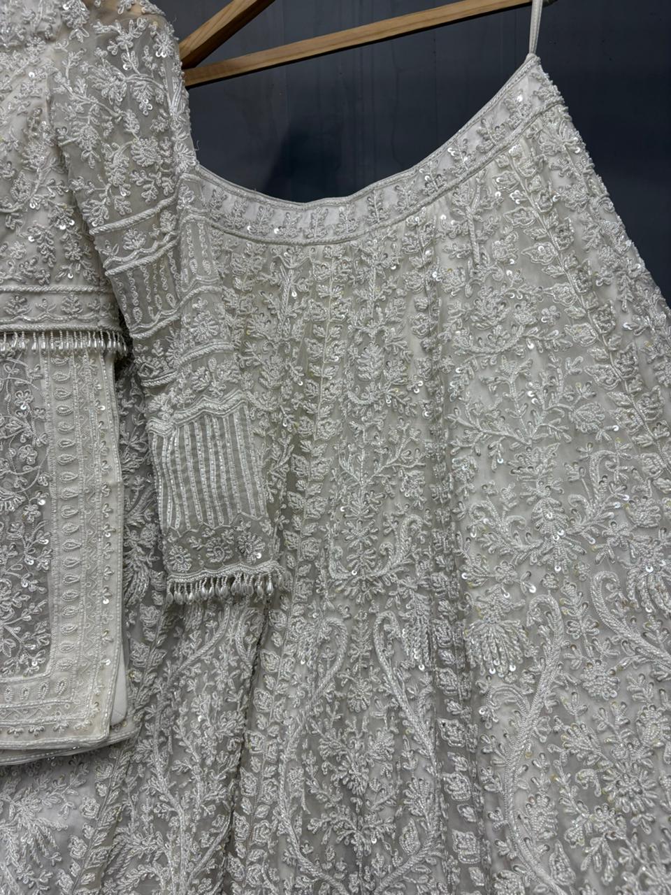Crafted entirely in pristine ivory, the ensemble is defined by its architectural embroidery that feels both contemporary and timeless. The blouse, featuring a classic square neckline and full-length sleeves, is encrusted with micro-sequins and pearls, while the lehenga skirt unfolds like the intricate arches of a heritage monument.