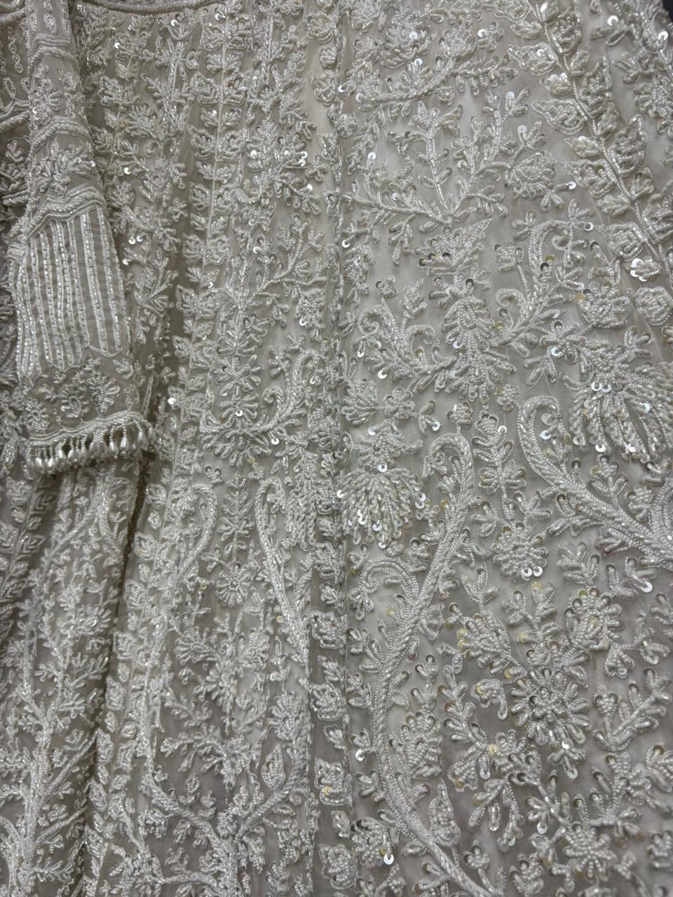 The dupatta adds a layer of romantic airiness, its monochromatic elegance ensuring a cohesive, luminous bridal silhouette.