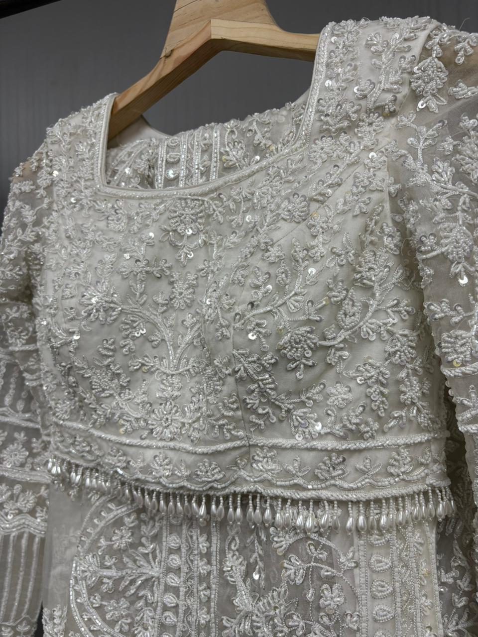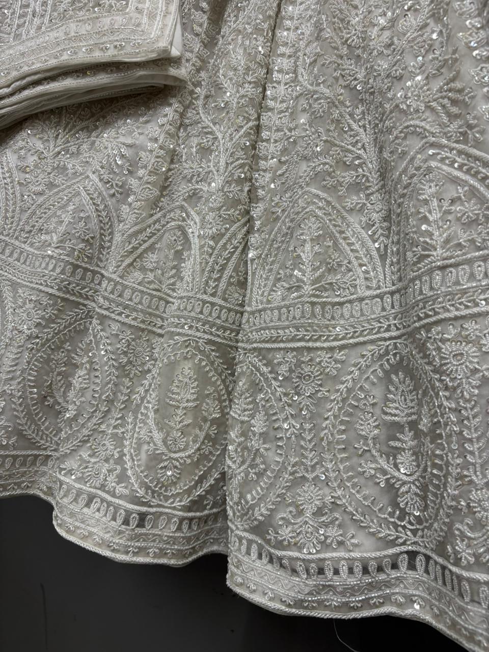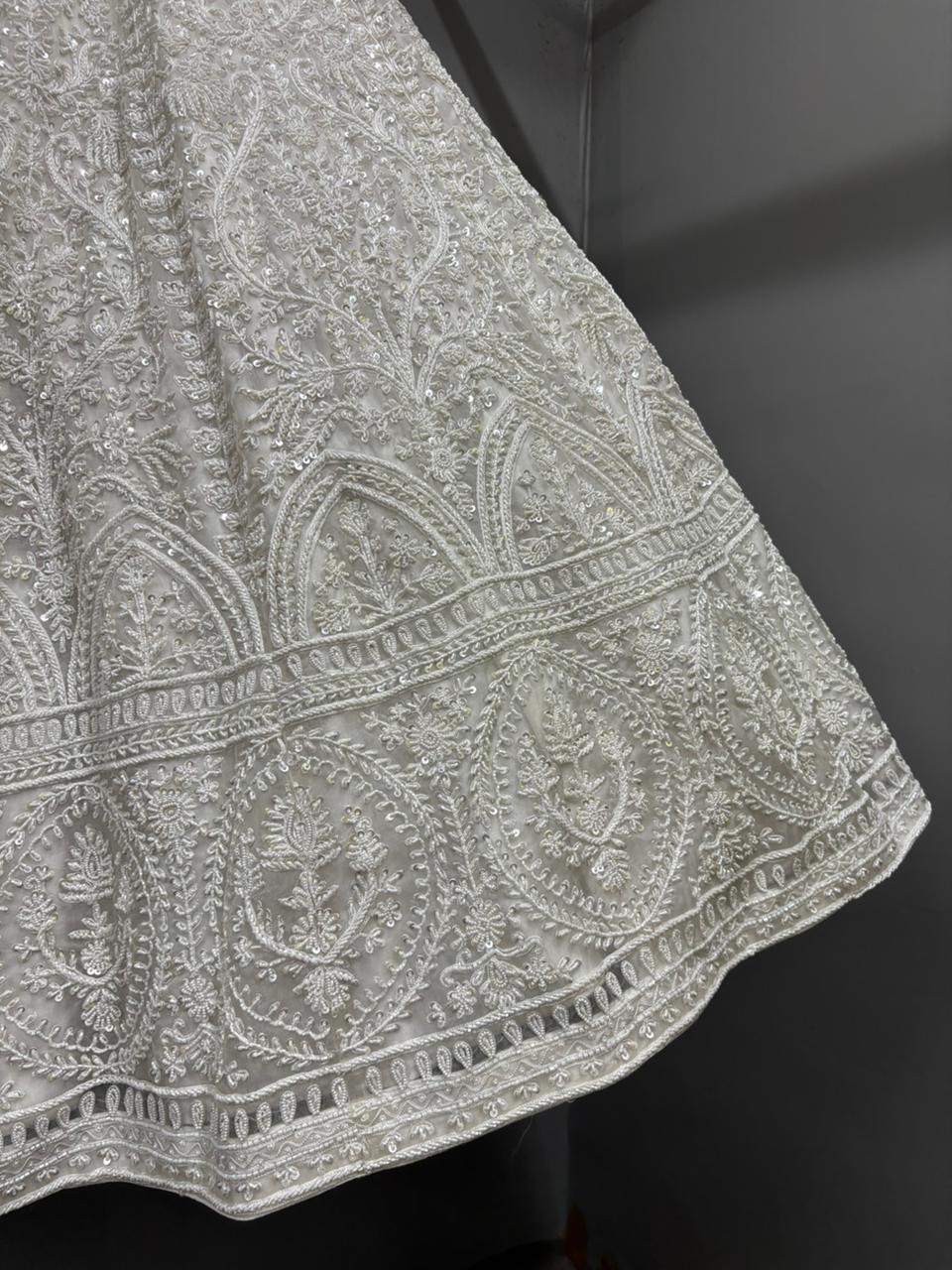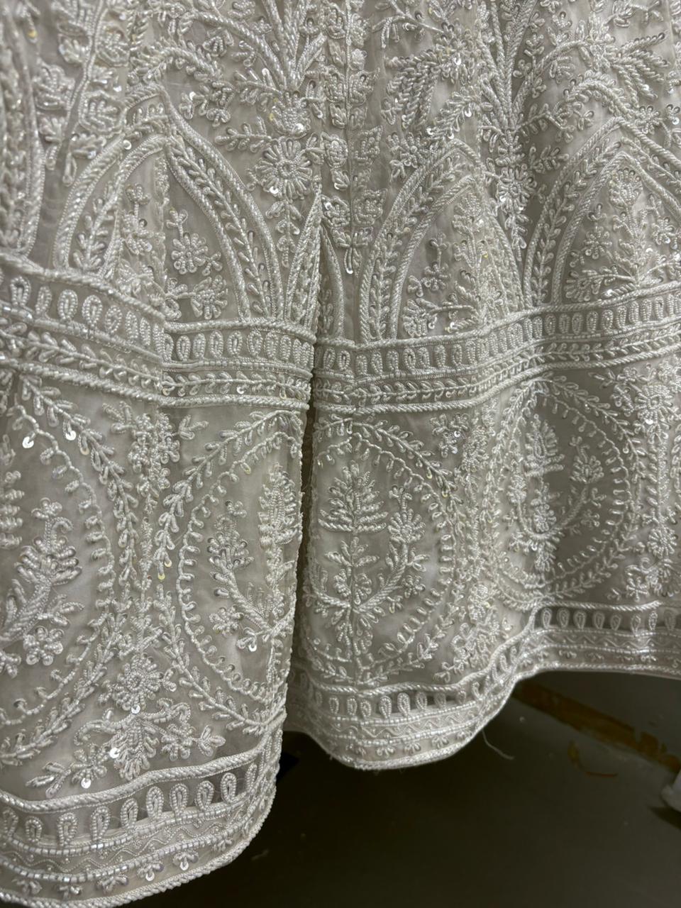 The "Ivory Cathedral" represents over 340 hours of meticulous hand-work. The unique challenge of this piece lies in the "Depth of Tone"—using only ivory threads and silver-lined sequins to create shadows and highlights. Each panel of the lehenga is individually embroidered to ensure the palatial arch motifs align with mathematical precision at every seam, creating a continuous landscape of heritage art.