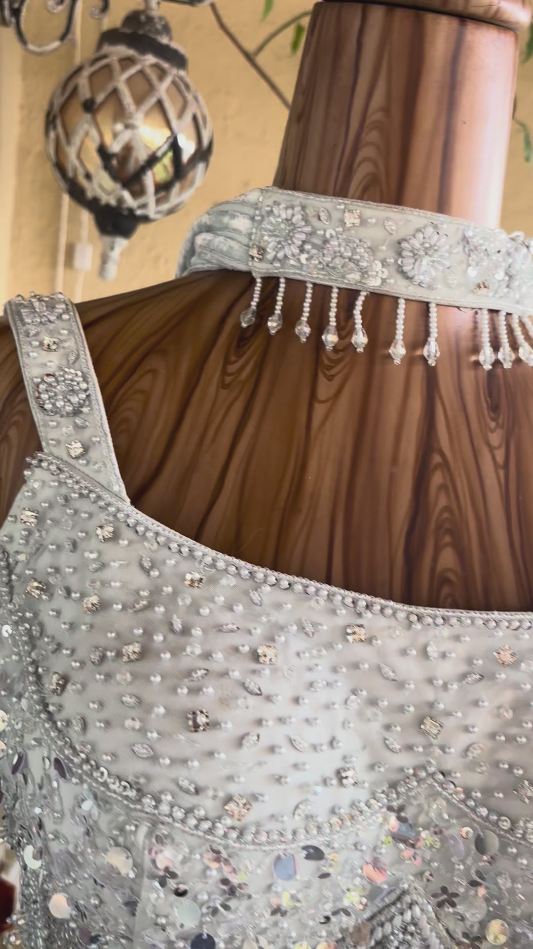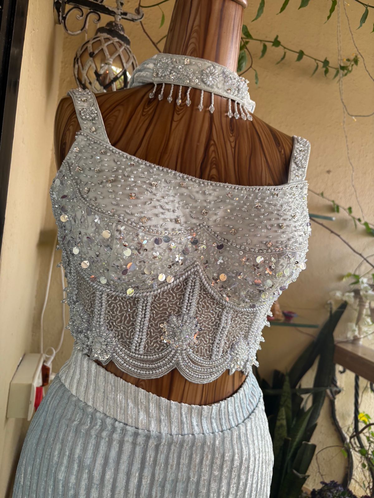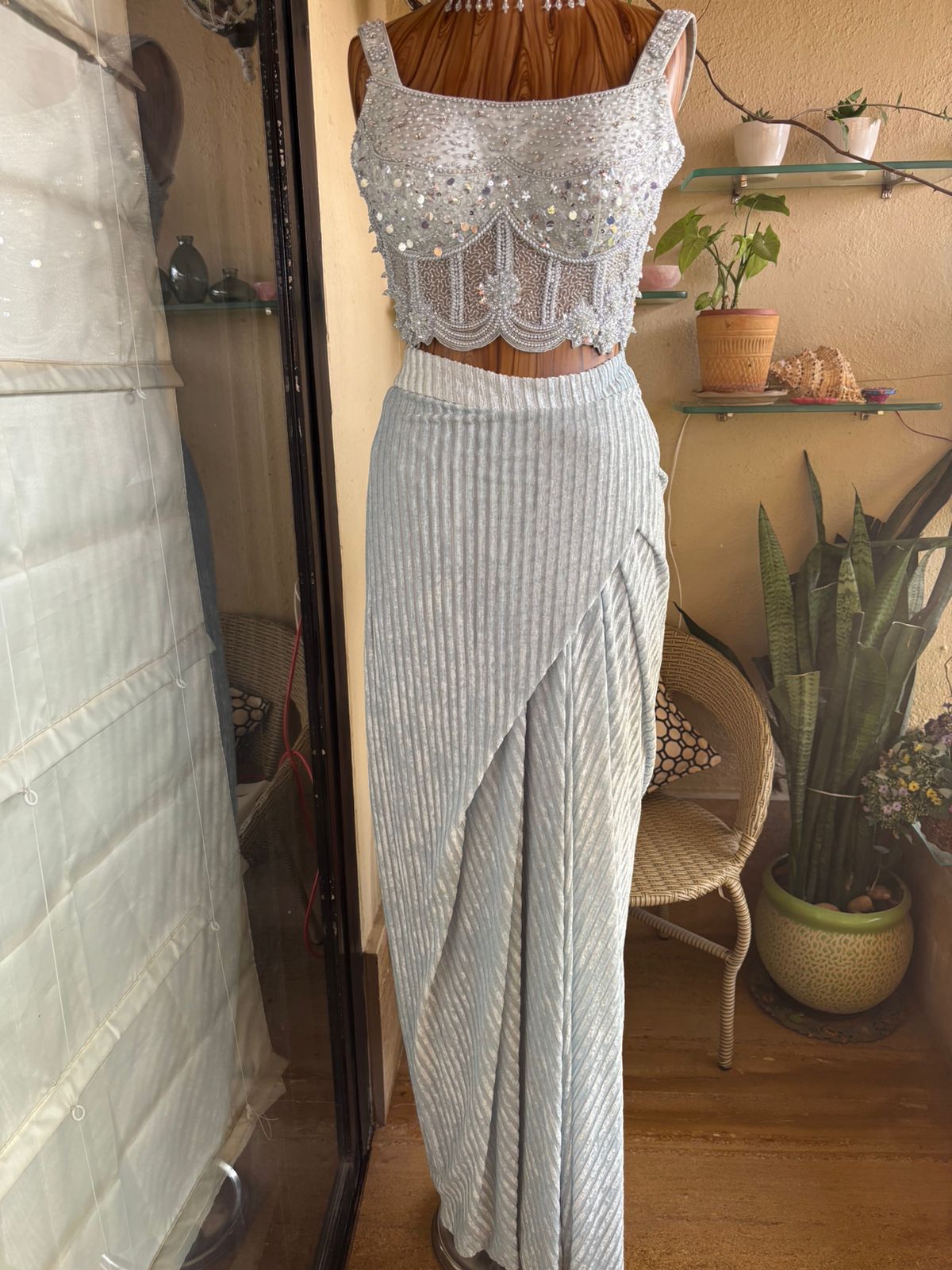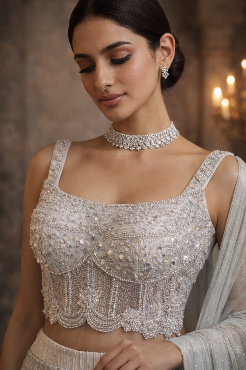Rendered in a cool ivory-silver palette, the ensemble pairs a heavily embellished corset-style blouse with a sleek pleated drape skirt. The bodice glistens with layered pearls, sequins, and crystal accents arranged in symmetrical patterns reminiscent of palace chandeliers. In contrast, the skirt falls in vertical pleats, creating elongation and graceful movement—balancing density with restraint.