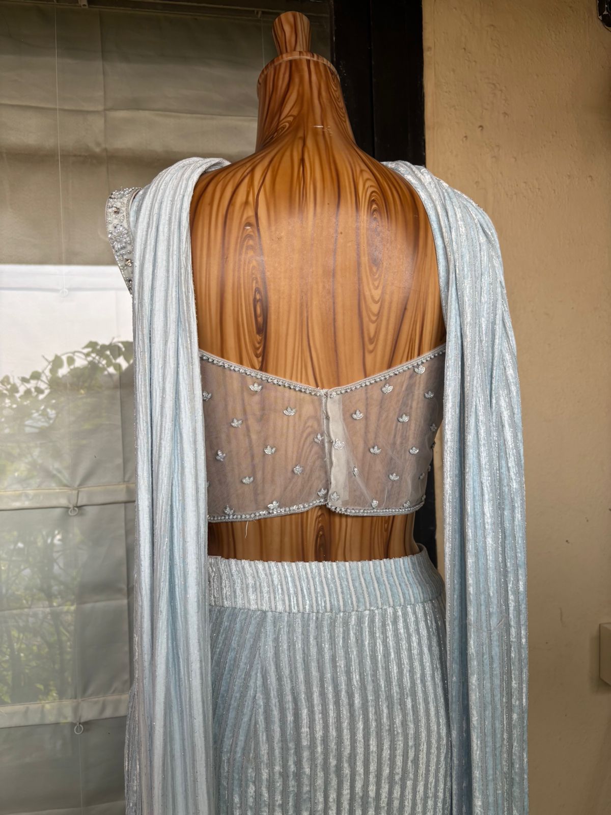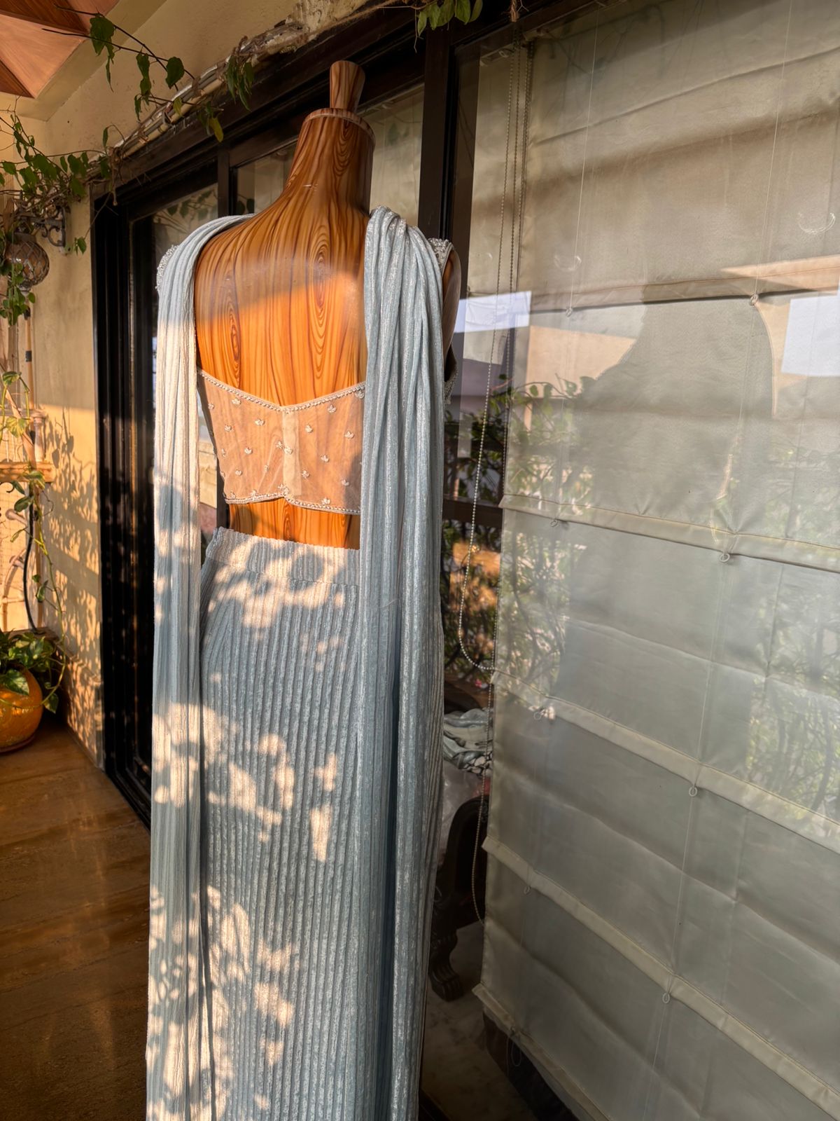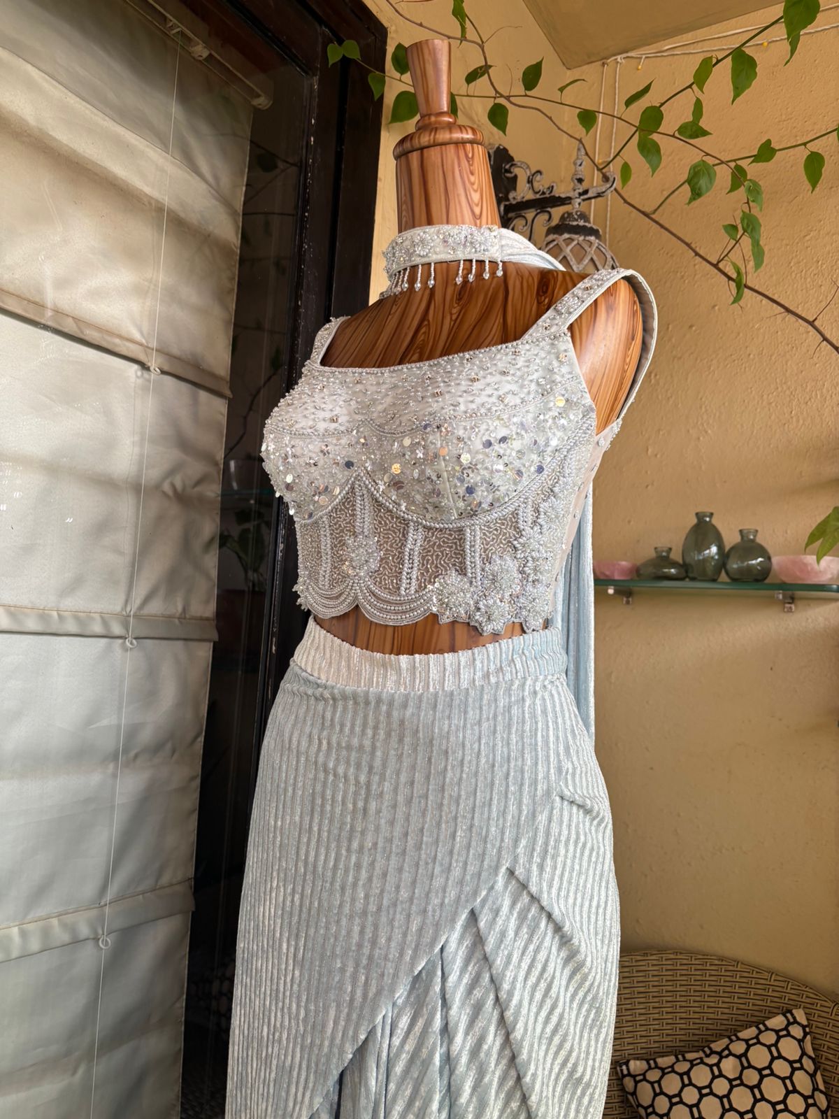 A luminous expression of modern opulence, Ivory Glacé Prism is where crystalline brilliance meets sculpted minimalism. Designed for the woman who glows rather than dazzles, this ensemble celebrates reflective textures, architectural beadwork, and fluid draping in the softest shade of frosted ivory. It is a couture statement of refined glamour—crafted for evenings bathed in candlelight and champagne sparkle.