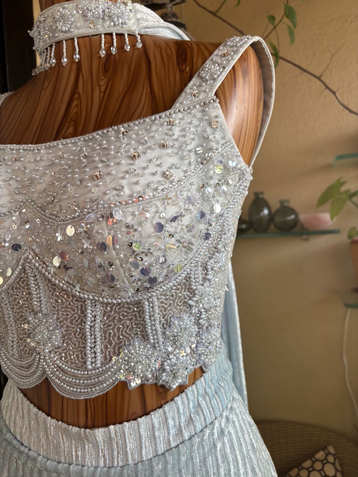 The Ivory Glacé Prism required over 450 hours of intricate handwork. The bodice is constructed with reinforced boning to support the dense bead layering, ensuring both comfort and posture enhancement. Each pearl and crystal is individually hand-set to maintain symmetrical alignment. The pleated skirt is precision-pressed and stitched to preserve vertical structure while allowing natural movement.