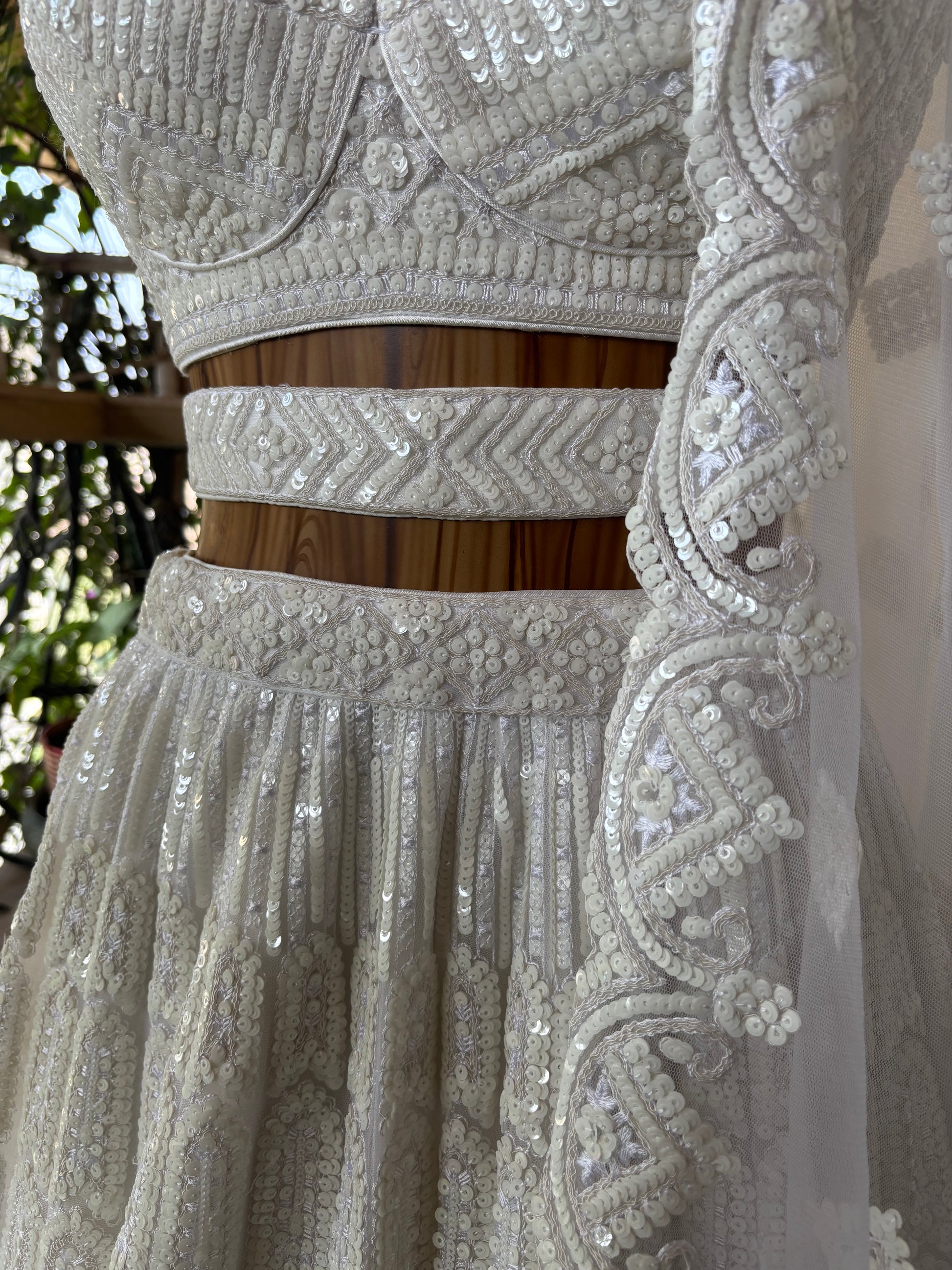 Crafted entirely in pristine ivory, the silhouette is defined by architectural embroidery that feels both contemporary and timeless. The blouse, structured yet fluid, glows with intricate handwork—where sequins, thread embroidery, and fine bead detailing come together in rhythmic harmony.