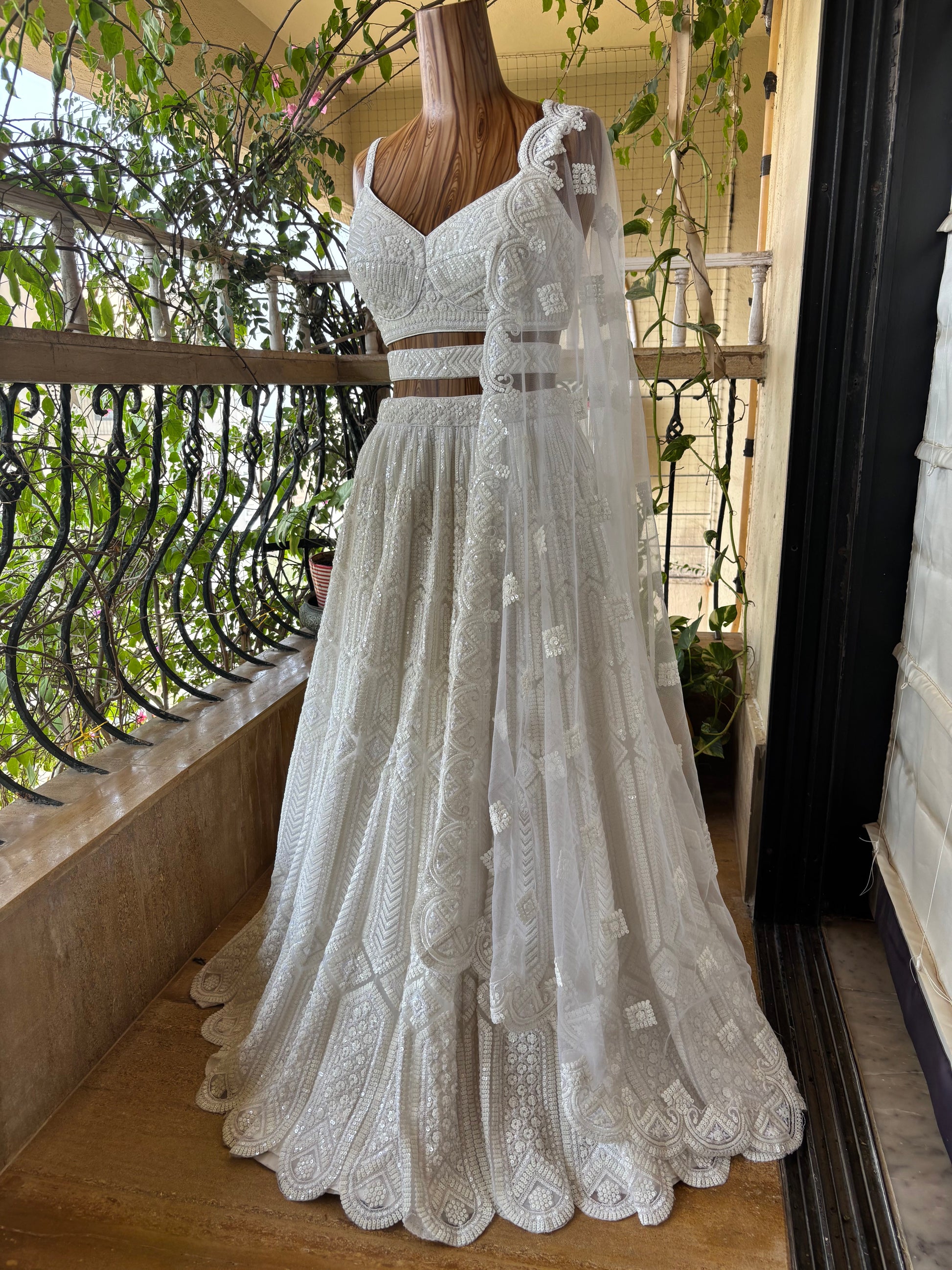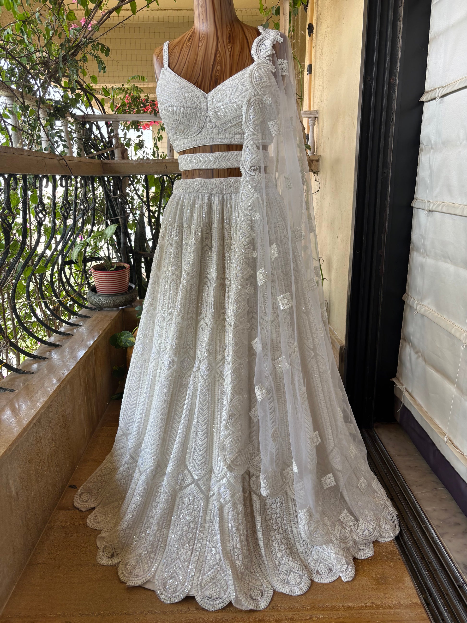 Each panel is embroidered individually and assembled to maintain symmetry and structure. The blouse construction ensures support while preserving delicacy, and the dupatta borders are hand-finished for a seamless couture drape.