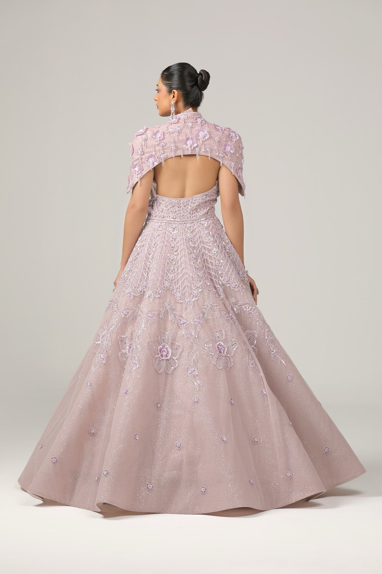 Draped in the softest shade of dusty lavender with intricate embroidery in lilac, silver, and blush tones, this ensemble is for the bride who sees her wedding as high fashion. Who understands that couture isn't about following traditions—it's about creating new ones. Who knows that sometimes, the most elegant choice is the most unexpected.
