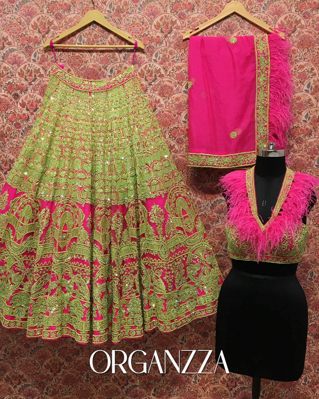 Crafted in electric lime green embroidery against shocking fuchsia pink, this ensemble is a masterclass in fearless color pairing and maximum embellishment. The peplum blouse flows with intricate threadwork, the lehenga tells stories through architectural motifs, and the feathered dupatta? It's not just an accessory—it's an entrance, an exclamation, a moment.