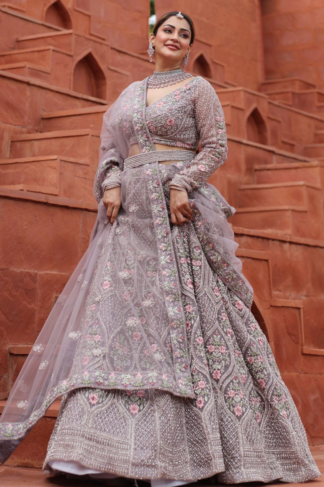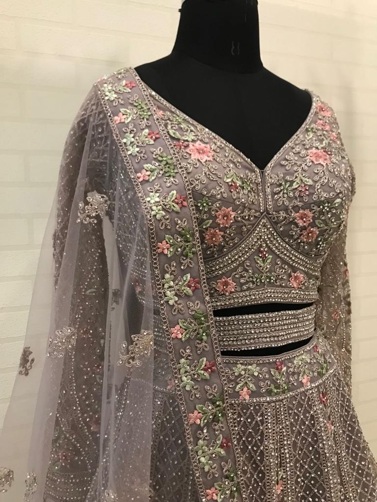 Draped in soft mauve-grey with delicate floral embroidery in blush pink and sage green, this ensemble is for the bride who chooses refinement over spectacle. Who understands that true luxury whispers in pastels and speaks through the language of flowers. Who knows that her wedding day deserves something both timeless and unforgettable.