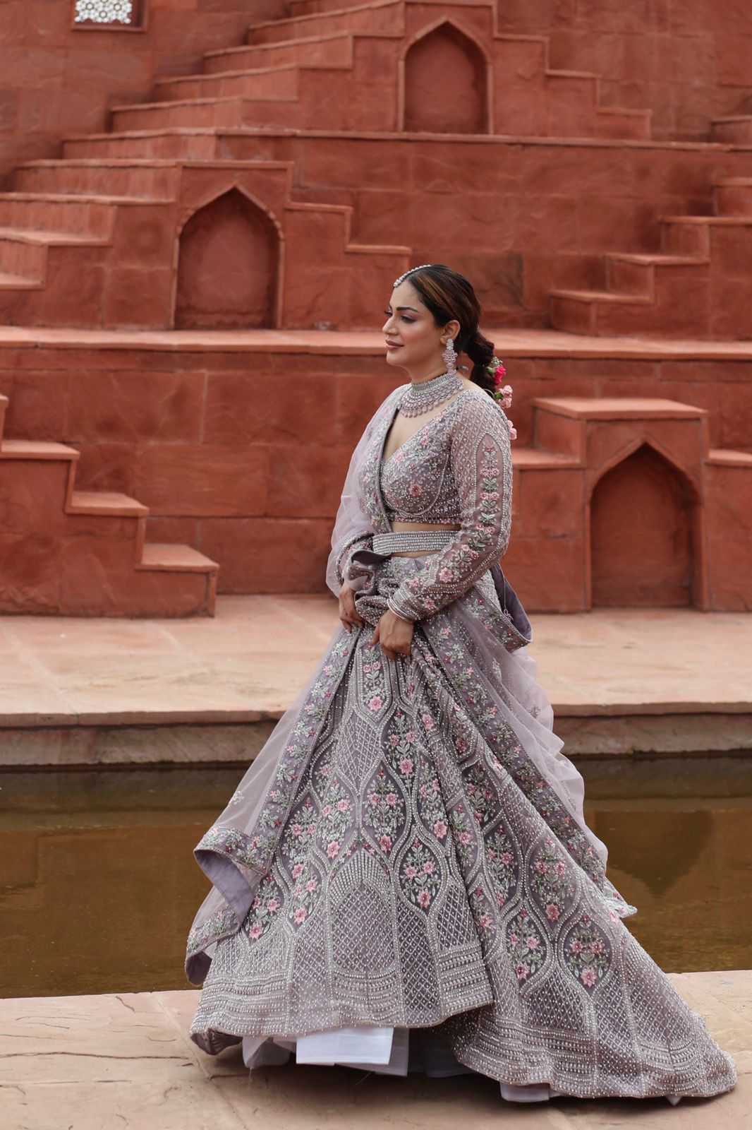 The lehenga follows a sophisticated design philosophy—structure at the base, romance throughout.