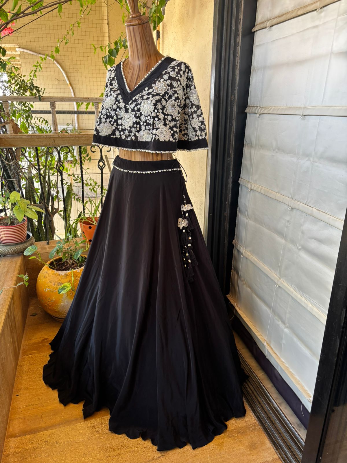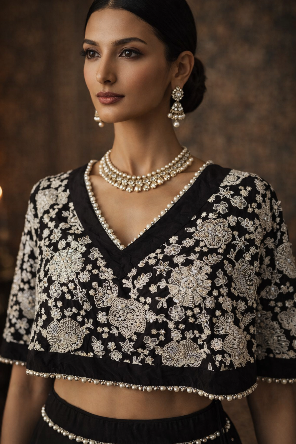 The design is refreshingly modern: a cropped blouse adorned with cascading floral embroidery, three-quarter sleeves for contemporary coverage, and a voluminous black lehenga that flows like liquid midnight. The silhouette is clean and current, perfect for the bride who wants to honor tradition through craft while making her own statement through color choice.